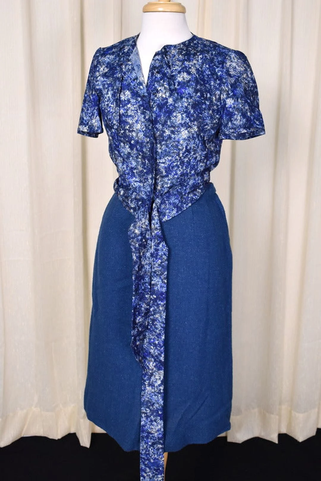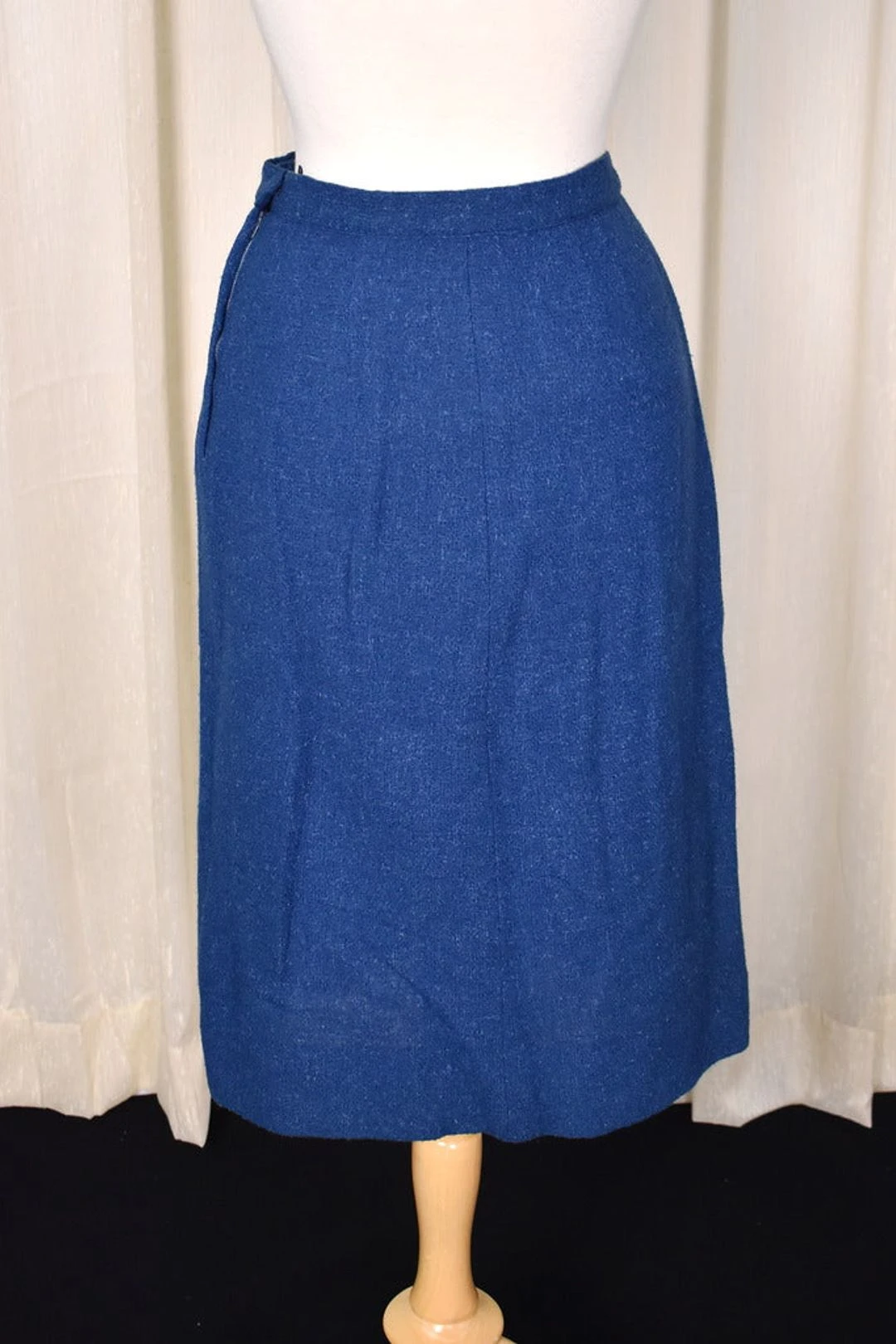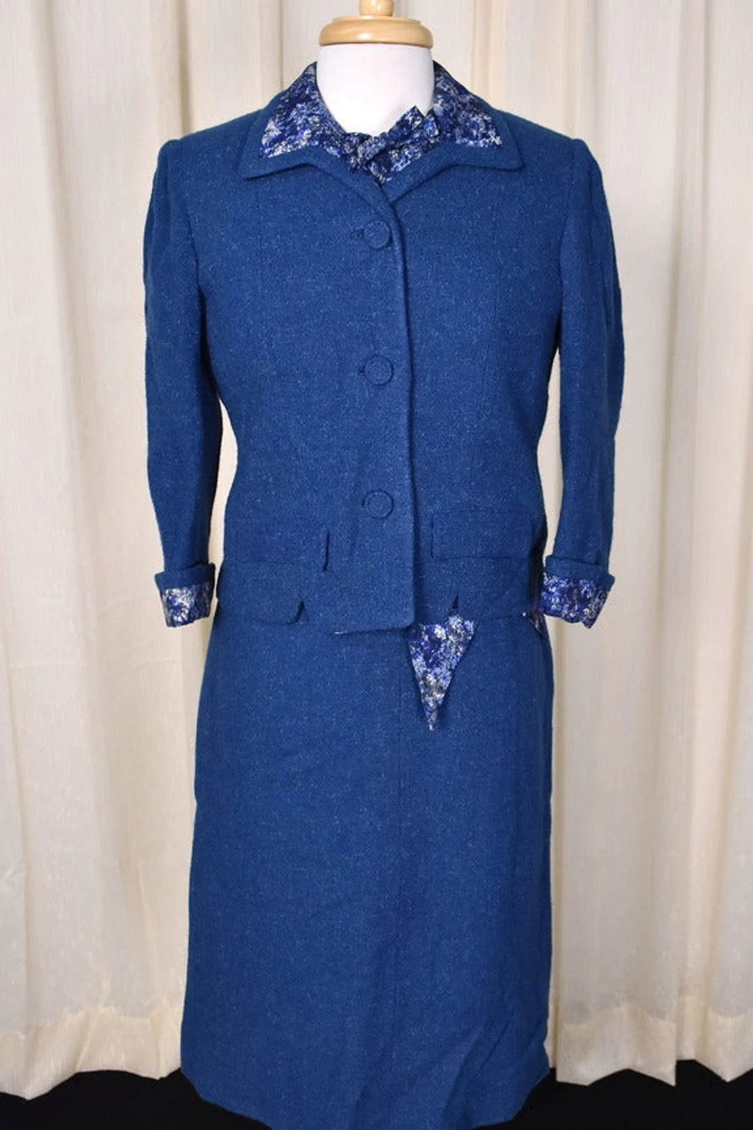 Ready for a classic 3 piece suit that never goes out of style? Perfect for mixing and matching! This early 1950s set comes with a structured blazer, faux wrap blouse, and a pencil skirt with a metal side zipper and hook and eyes. The blouse is collarless with a tie, has short sleeves, snaps down the front, and tie waist. The jacket is a fitted style with 3/4 length rolled contrasting sleeves, small contrasting collar, faux pockets, notched hem, and all the original fabric covered buttons down the front. It is in excellent condition, minor yellowing on the blouse collar, not noticeable because of the pattern and if you wear the jacket over it. The fabric is rich blue wool tweed and a cotton poly blend in printed blue, white, black, and gray. Jacket is fully lined in what feels like acetate. Label on jacket reads, “Flora E. Hatch, Lockport, NY Snyder, NY”, label on blouse reads “Davidow” with a union tag. The bust of the blouse is 36 inches, length 18 1/2. Jacket has a 36 inch bust, with a 34 inch waist, and 20 inch length. The skirt has a 26 inch waist and measures 27 inches long. Shown on a dress form measuring Bust 36″, Waist 25″, Hips 36″. This is an authentic vintage piece in wearable condition, that was cleaned and repaired (if necessary). Flaws will be noted, but please ask any questions you may have as this is a FINAL SALE garment and cannot be returned. All items are measured flat the same way we measure our reproduction items. The maximum measurement is listed. Most vintage fabrics do not have stretch, so please take that into consideration when looking at size.