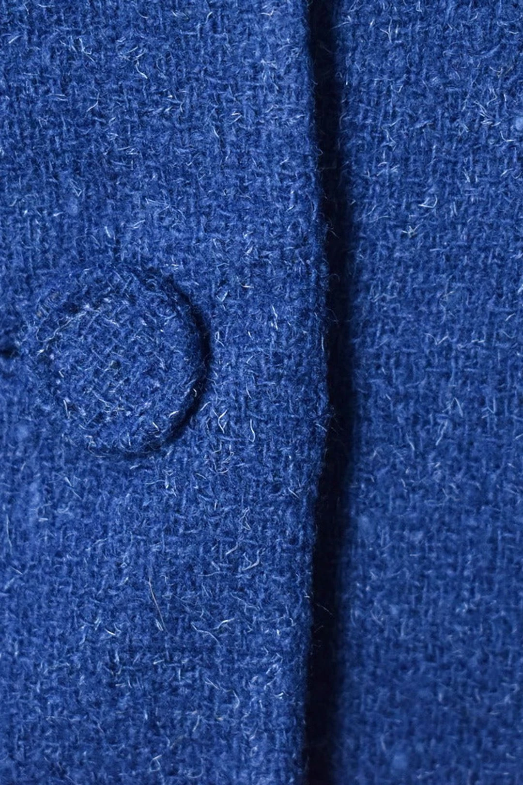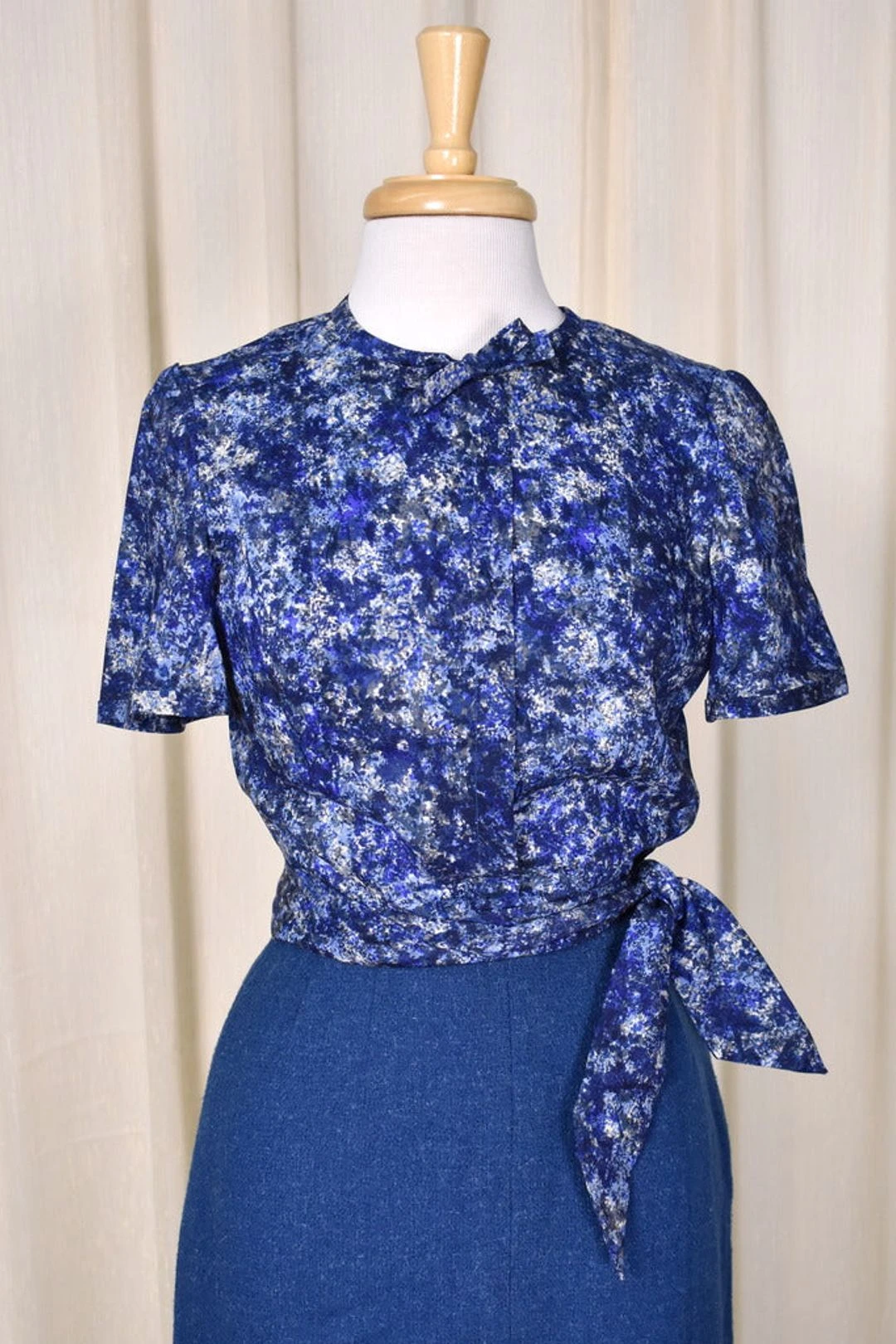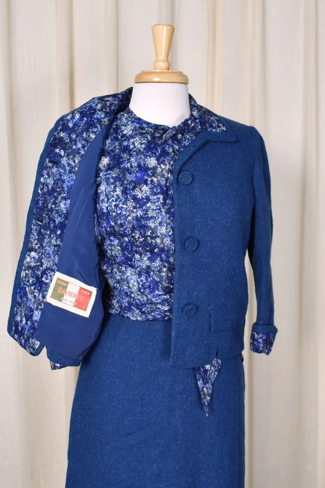 Ready for a classic 3 piece suit that never goes out of style? Perfect for mixing and matching! This early 1950s set comes with a structured blazer, faux wrap blouse, and a pencil skirt with a metal side zipper and hook and eyes. The blouse is collarless with a tie, has short sleeves, snaps down the front, and tie waist. The jacket is a fitted style with 3/4 length rolled contrasting sleeves, small contrasting collar, faux pockets, notched hem, and all the original fabric covered buttons down the front. It is in excellent condition, minor yellowing on the blouse collar, not noticeable because of the pattern and if you wear the jacket over it. The fabric is rich blue wool tweed and a cotton poly blend in printed blue, white, black, and gray. Jacket is fully lined in what feels like acetate. Label on jacket reads, “Flora E. Hatch, Lockport, NY Snyder, NY”, label on blouse reads “Davidow” with a union tag. The bust of the blouse is 36 inches, length 18 1/2. Jacket has a 36 inch bust, with a 34 inch waist, and 20 inch length. The skirt has a 26 inch waist and measures 27 inches long. Shown on a dress form measuring Bust 36″, Waist 25″, Hips 36″. This is an authentic vintage piece in wearable condition, that was cleaned and repaired (if necessary). Flaws will be noted, but please ask any questions you may have as this is a FINAL SALE garment and cannot be returned. All items are measured flat the same way we measure our reproduction items. The maximum measurement is listed. Most vintage fabrics do not have stretch, so please take that into consideration when looking at size.