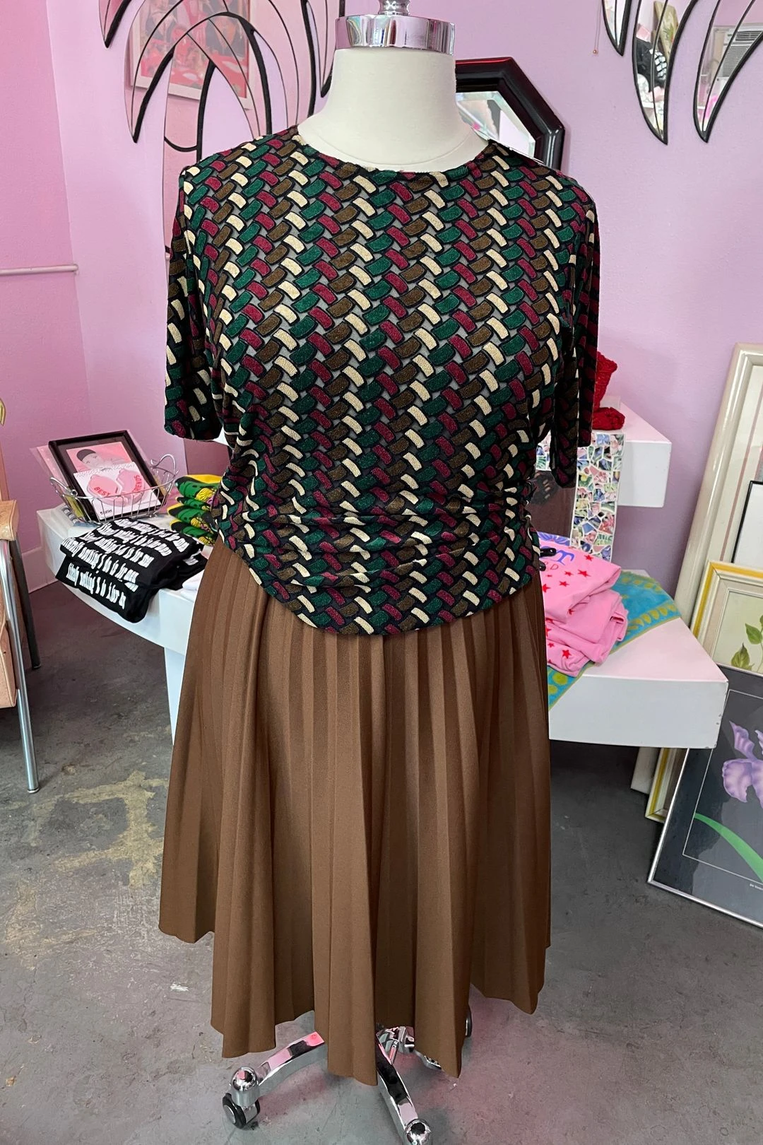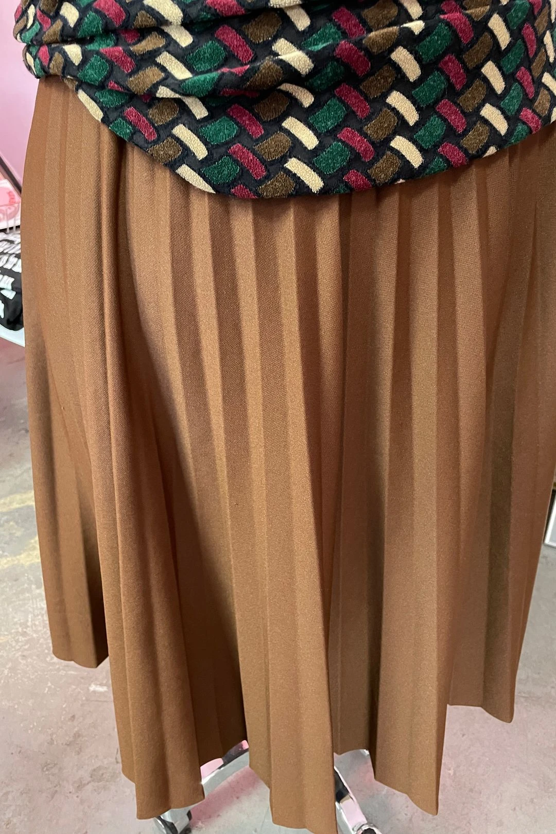 Vintage brown polyester accordion skirt hits about the knee. This neutral skirt has a timeless style.