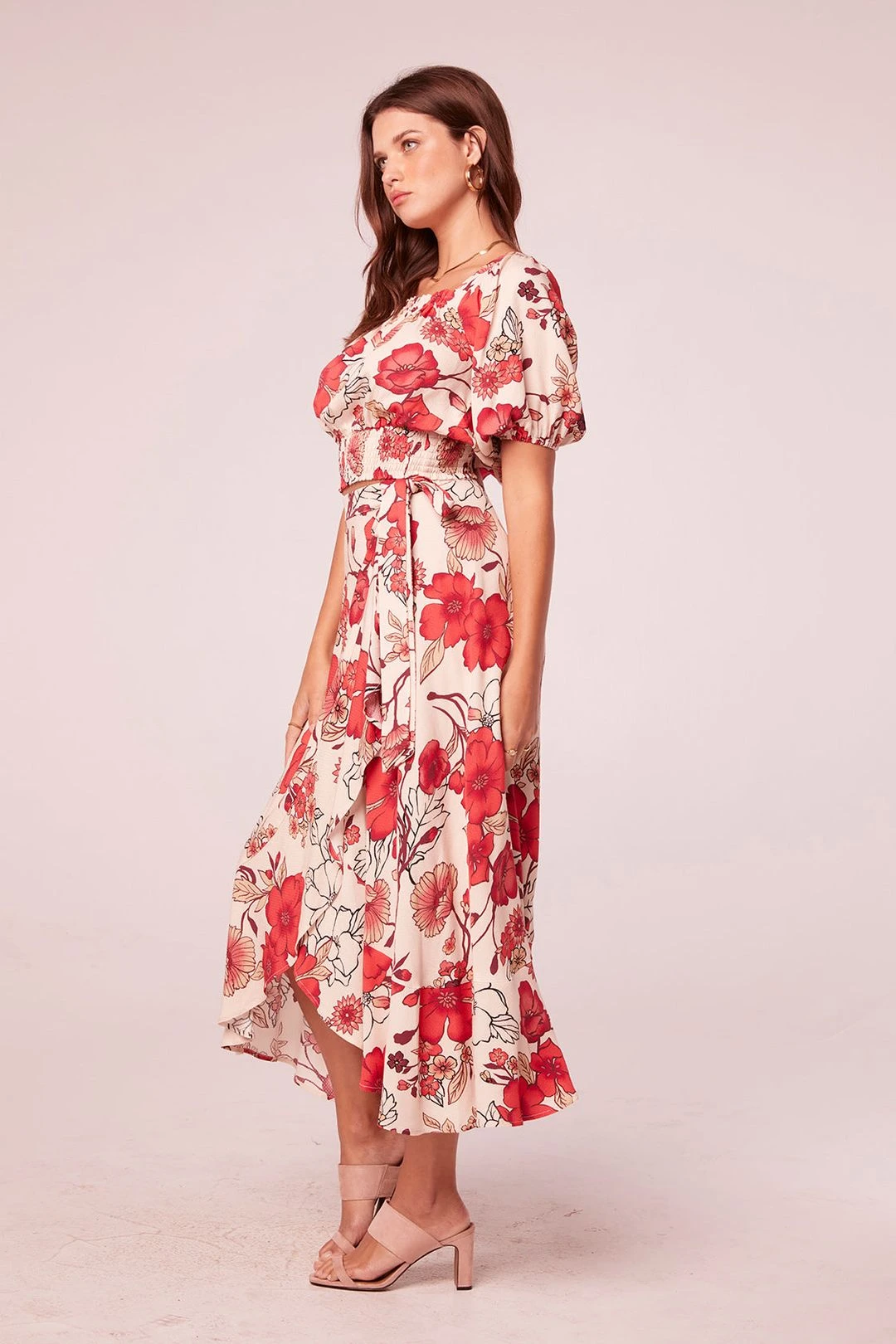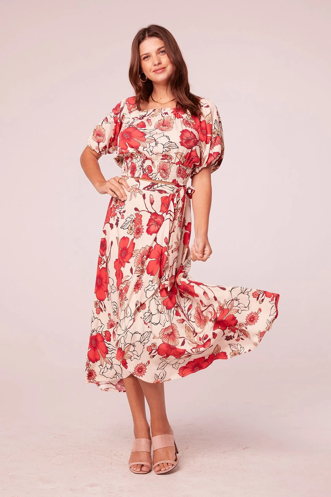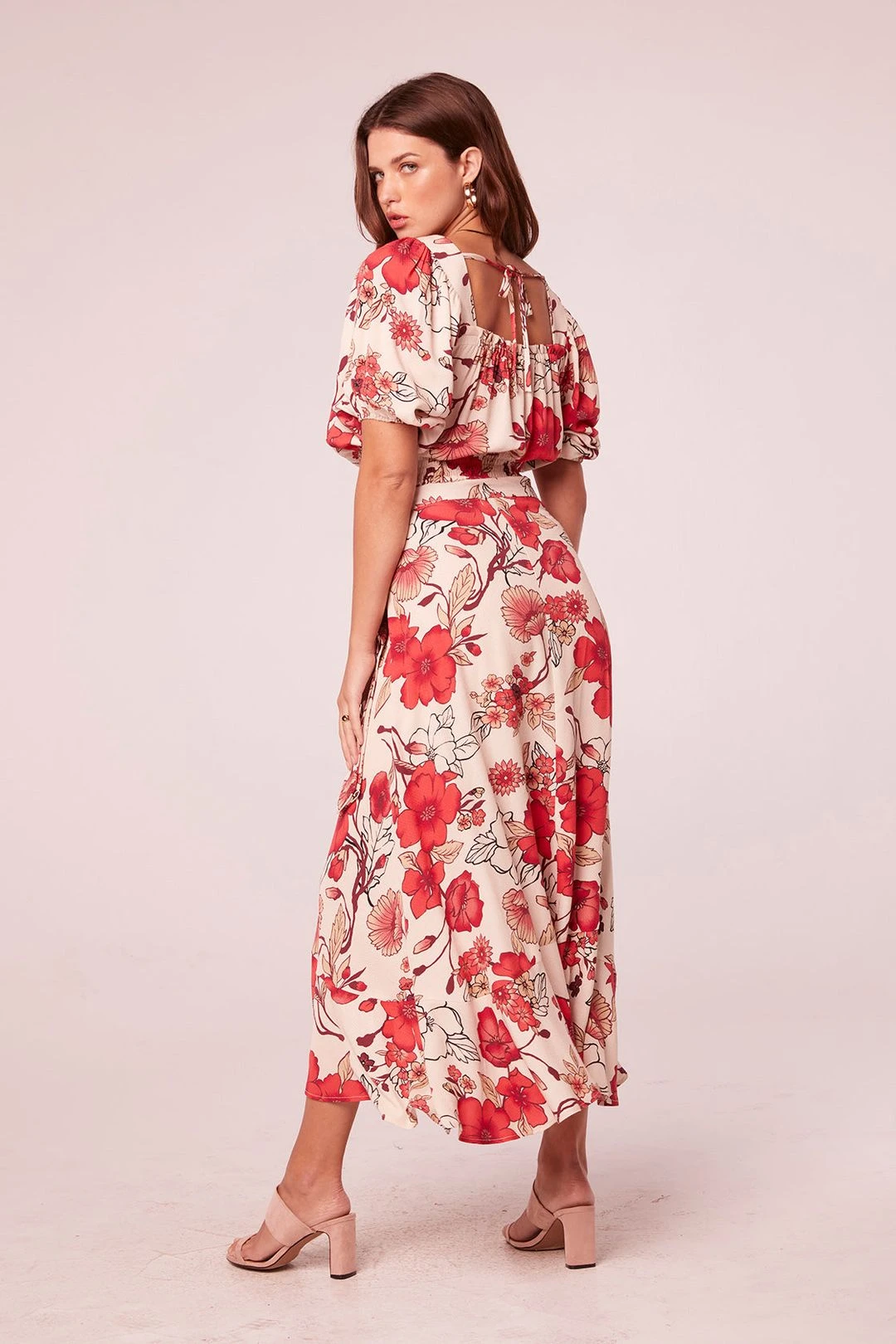 A wrap silhouette is covered in bright blossoms on our swingy Adri maxi skirt.