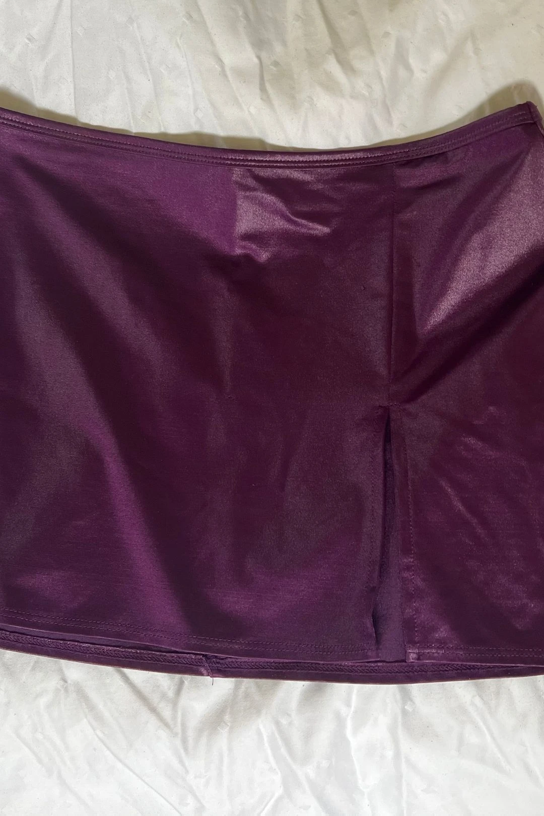 Vintage made in USA soft metallic purple low waist mini skirt with elastic stretch waist and and side slit