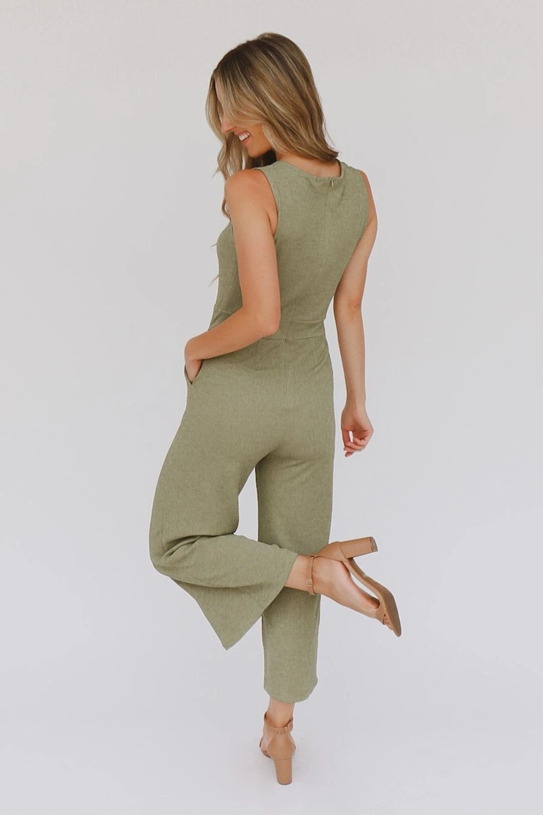 Green sleeveless cropped jumpsuit with pockets and front slit detail.