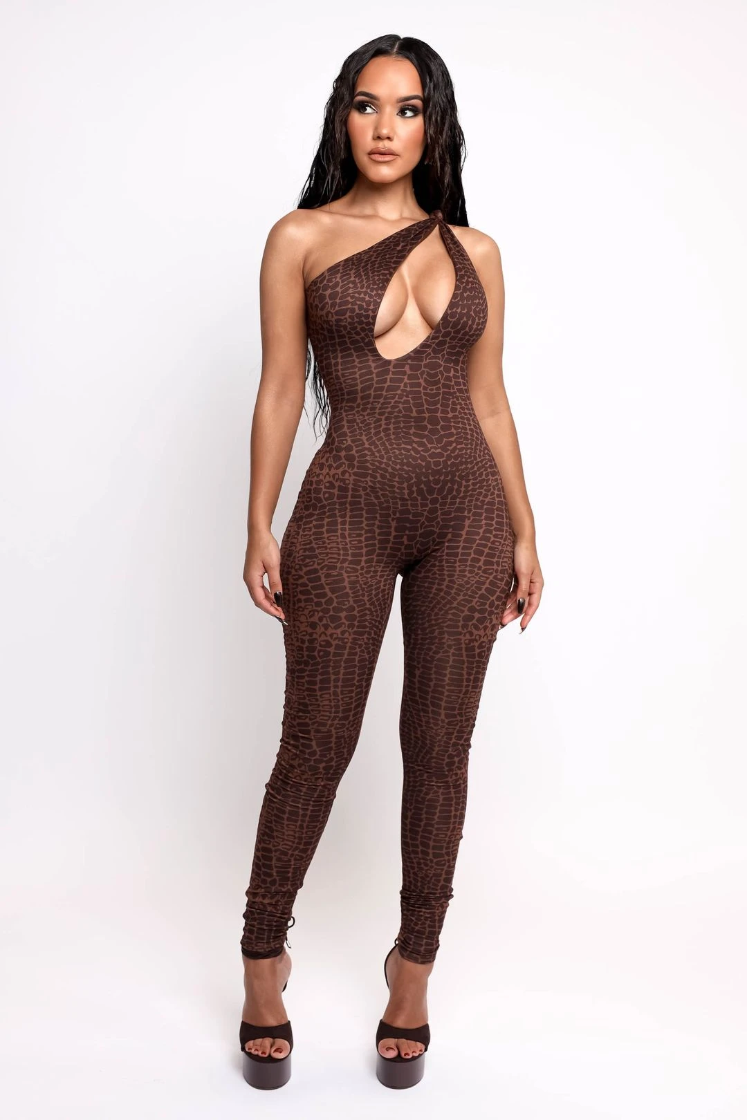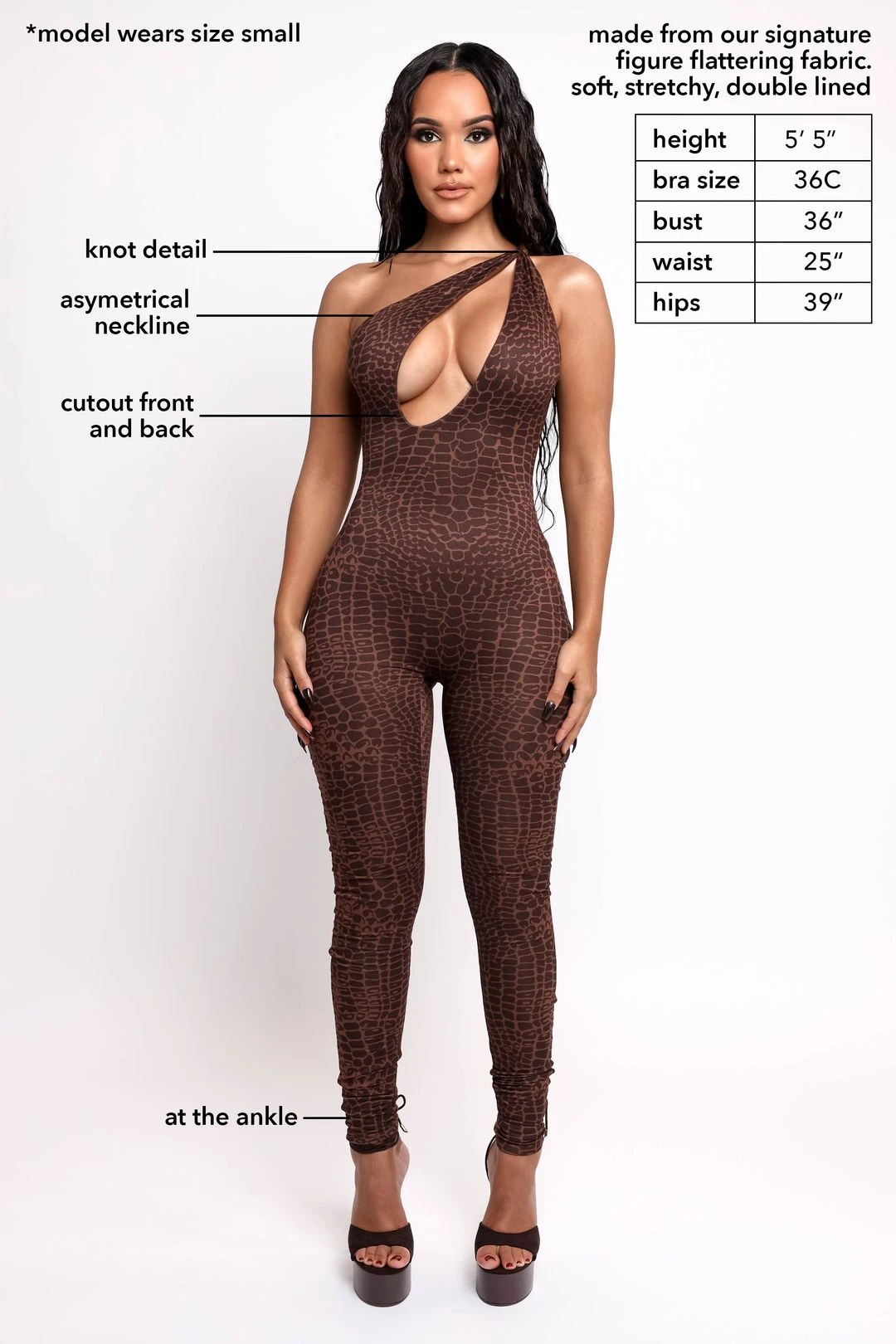 Combining our most popular style with a more comfort look. The ‘Ariana Jumpsuit’ includes a symmetrical cut that gives the jumpsuit a touch of sexy. Fabric is extremely soft, but still very fitting for night out or a night in. No need for a zipper or an opening since it’s easy to get in and out of it. Our jumpsuit is ankle length which gives you that slim thick vibes everywhere you go. Choose to be hot wearing our best jumpsuit yet.Â