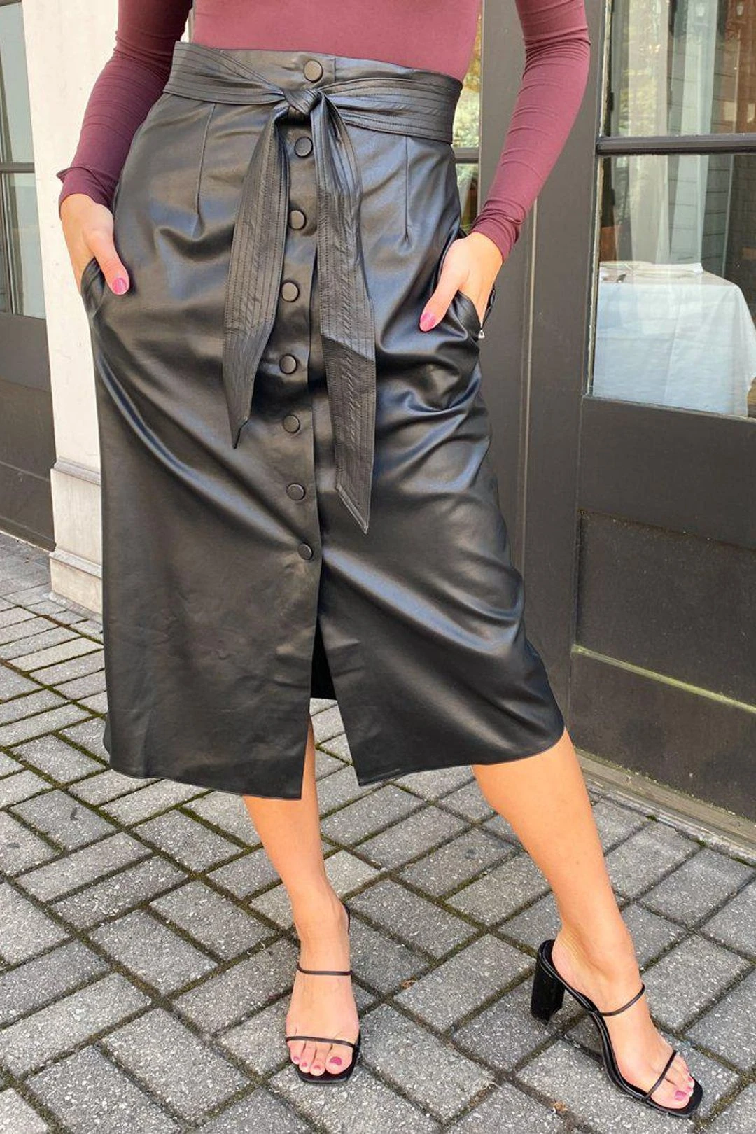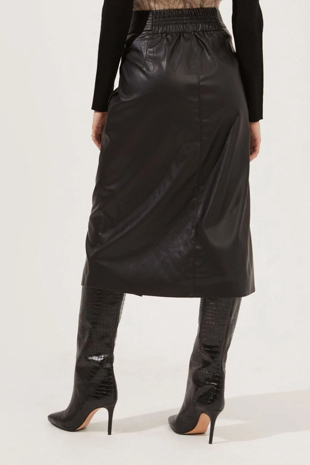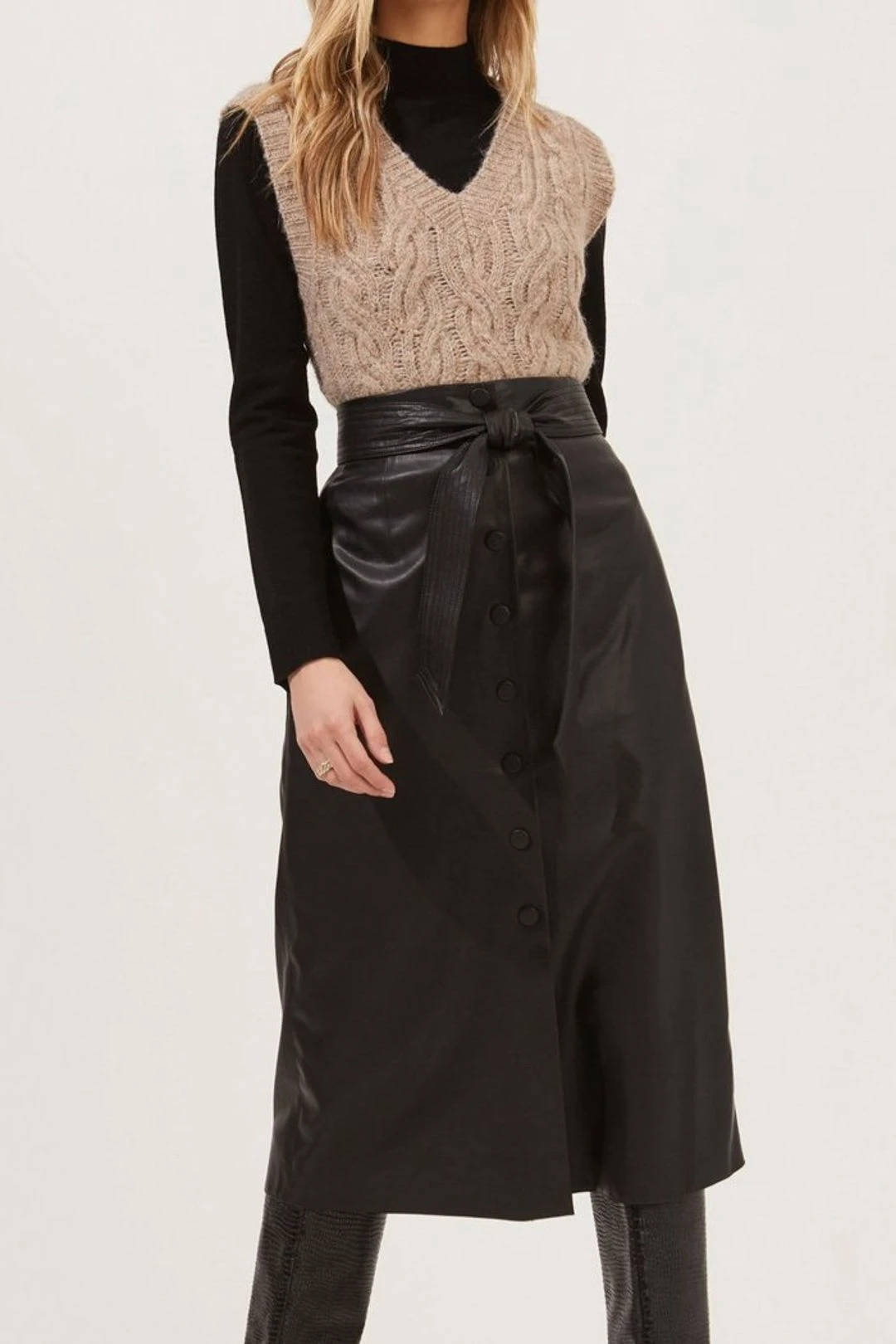 From desk to date night, the Lorette Skirt is a versatile wardrobe essential. It features a faux leather construction with an attached tie waist belt and smocking at the back of the waist. Tonal front button placket leads to a vented hem. Functional hip pockets. Fit is true to size. Model is wearing a size S.Â