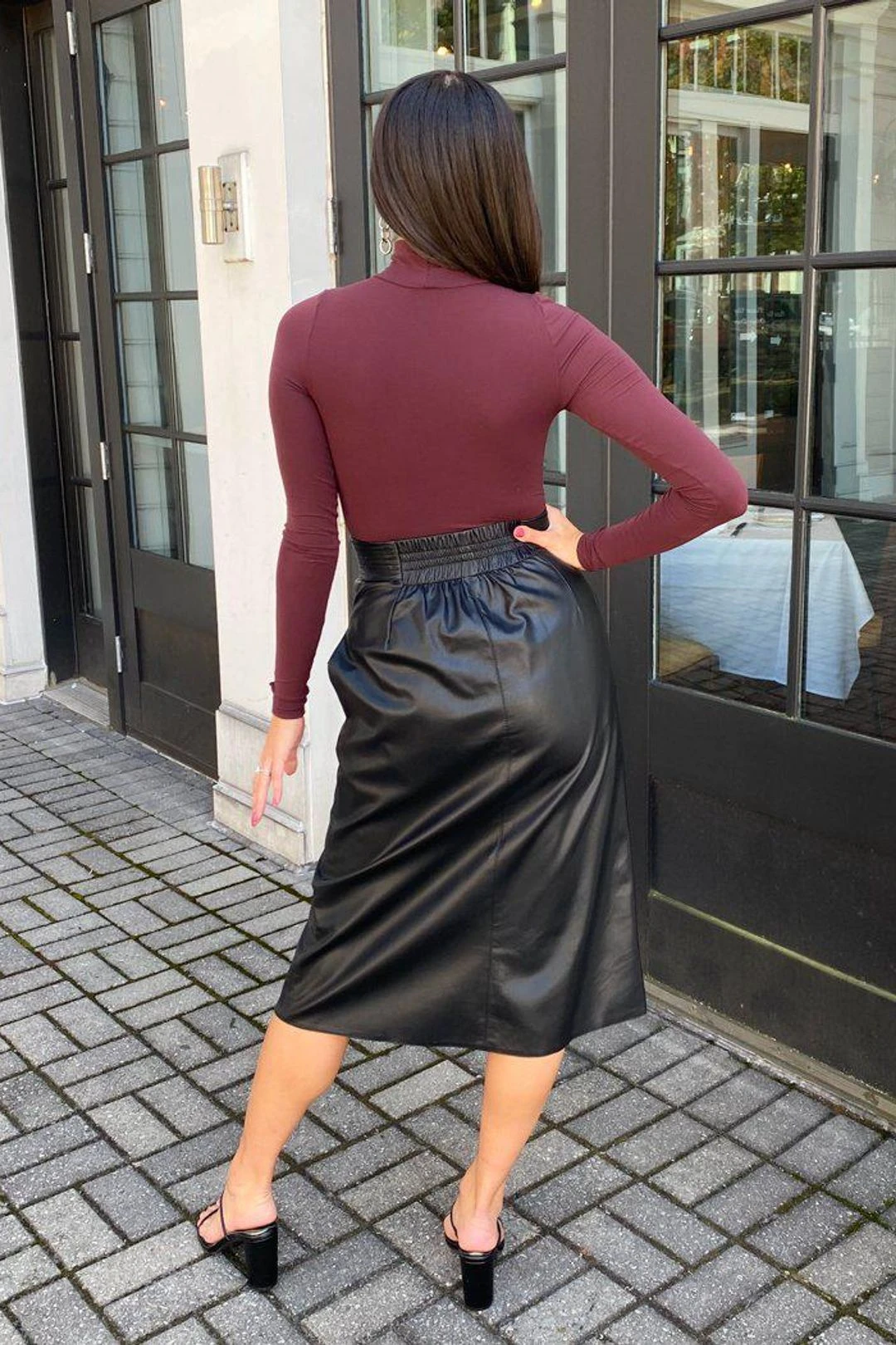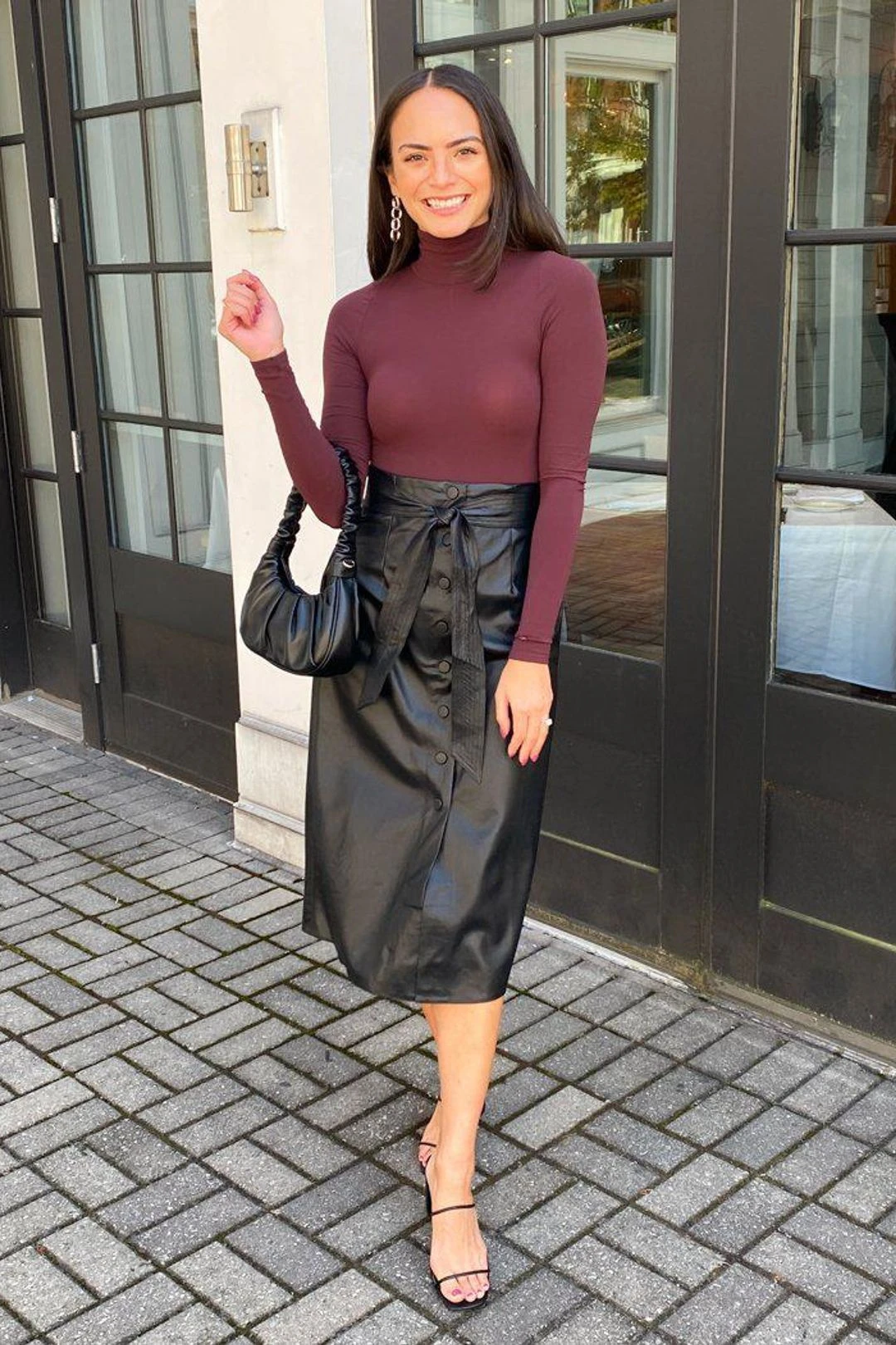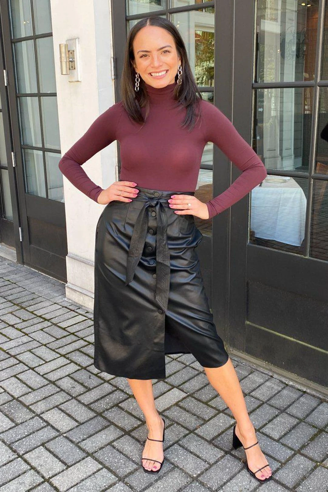 From desk to date night, the Lorette Skirt is a versatile wardrobe essential. It features a faux leather construction with an attached tie waist belt and smocking at the back of the waist. Tonal front button placket leads to a vented hem. Functional hip pockets. Fit is true to size. Model is wearing a size S.Â