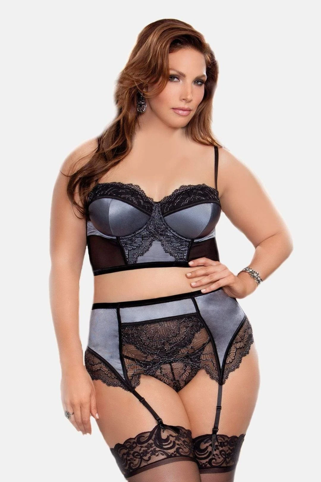 ATHENA Satin & Lace Bra + Garter Set In Gray-Black