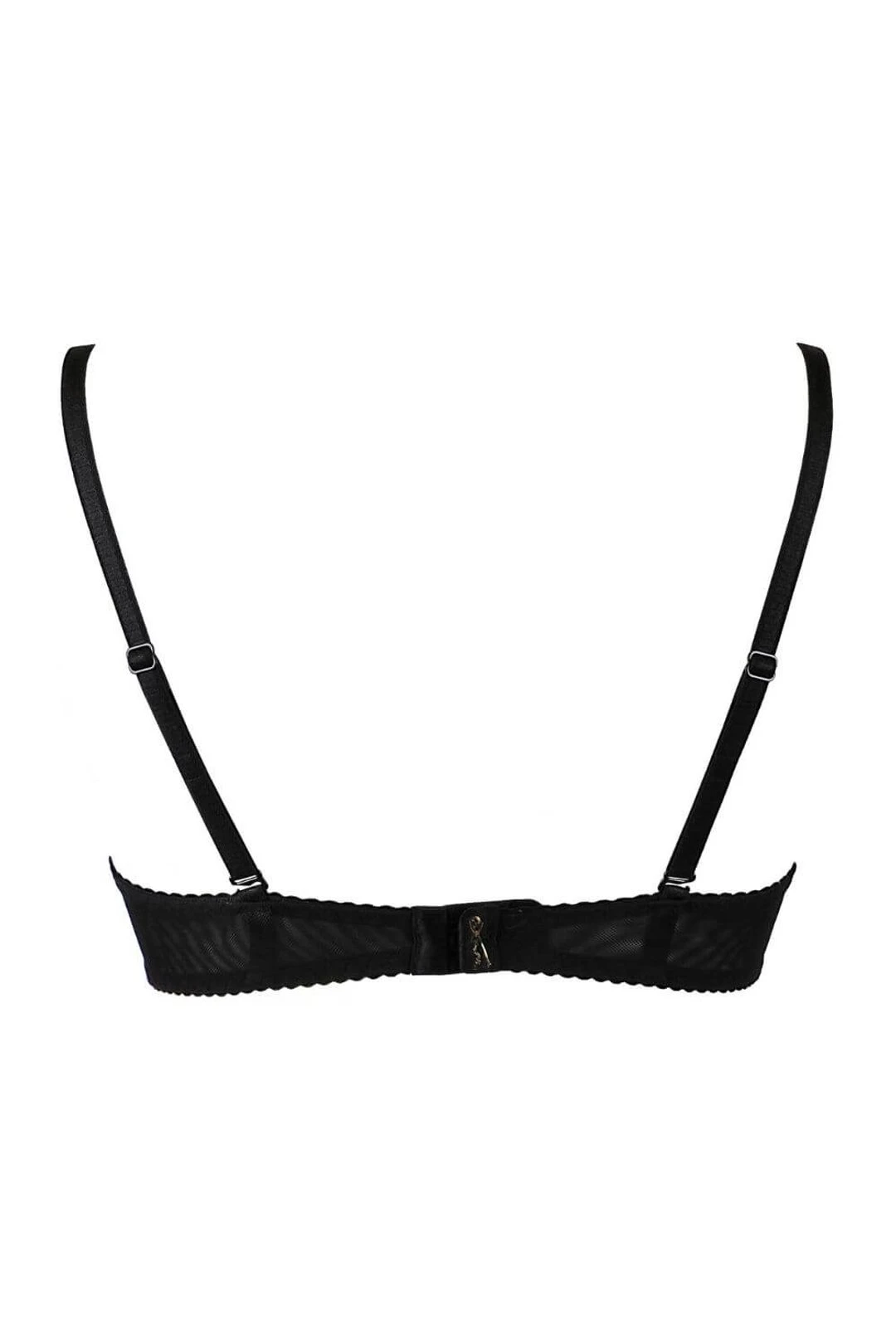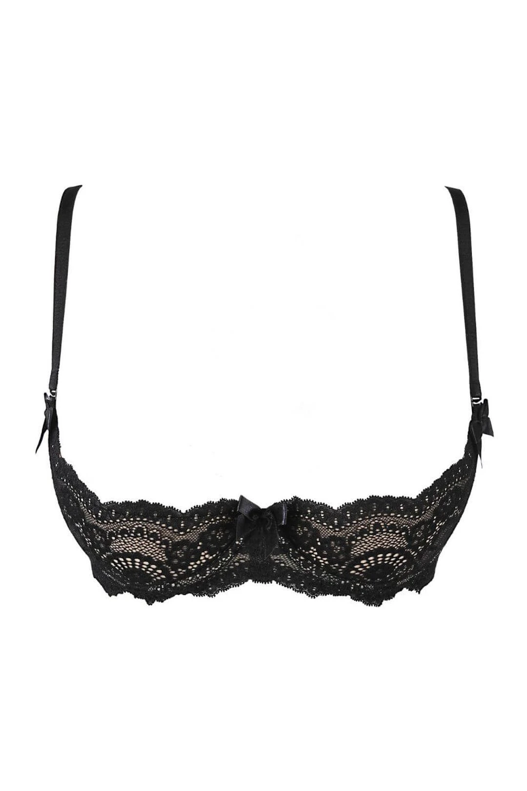 Surprise Me shelf bra with open cups is daring and romantic. The black lace overlays beige cups with a scalloped effect. Quarter cups are lined and underwired for incredible support. Straps are adjustable and removable. Harness piece not included.
