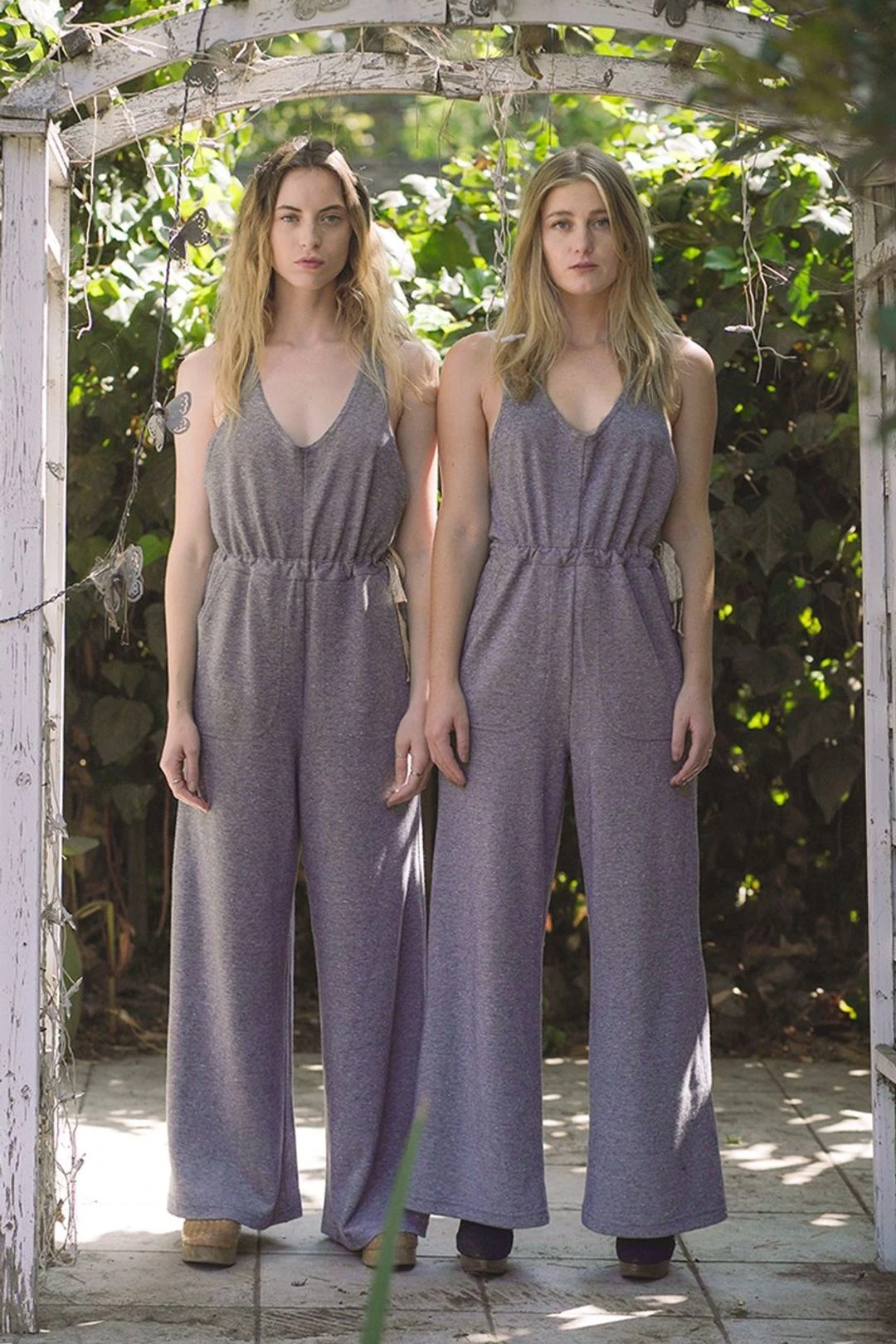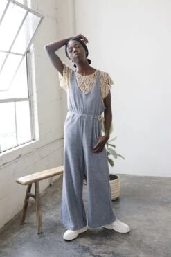 Wide leg tank jumpsuit with plunging neckline and a drawstring waistline. Two-button closure at the back of the neck for easy on and off. Pop a blouse underneath or top off with a jacket. Made with easy cotton knit jersey and adjustable drawstring waist for comfort.