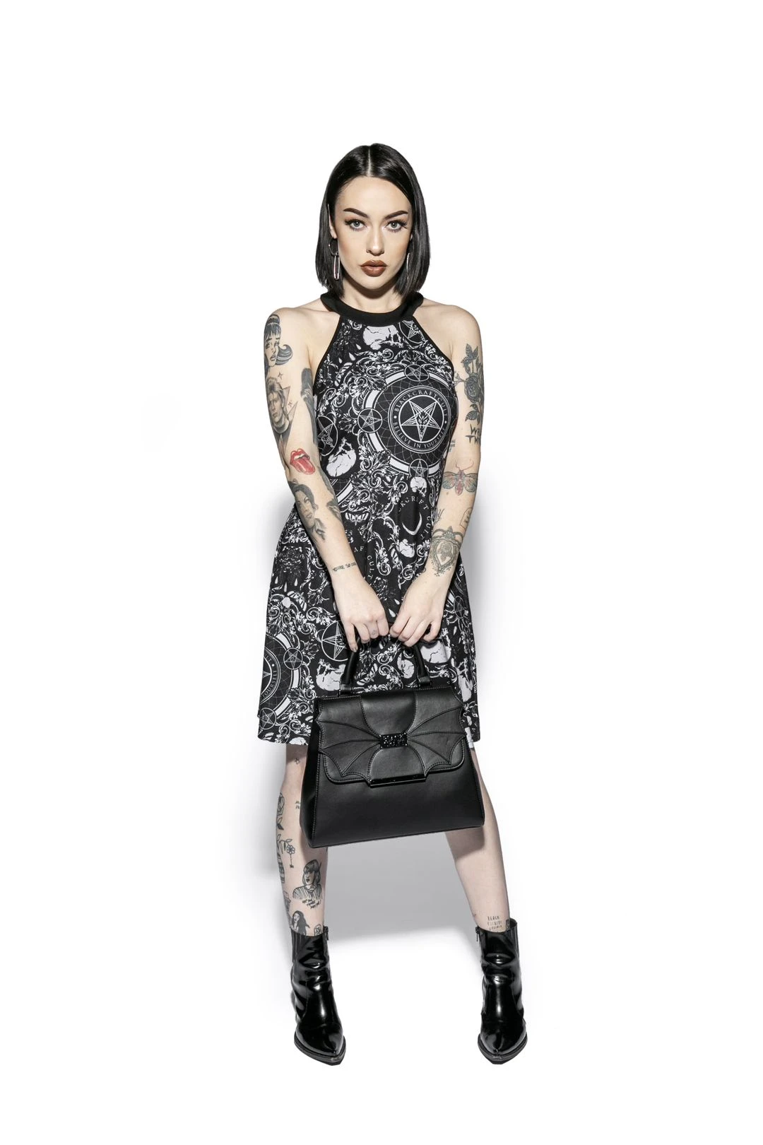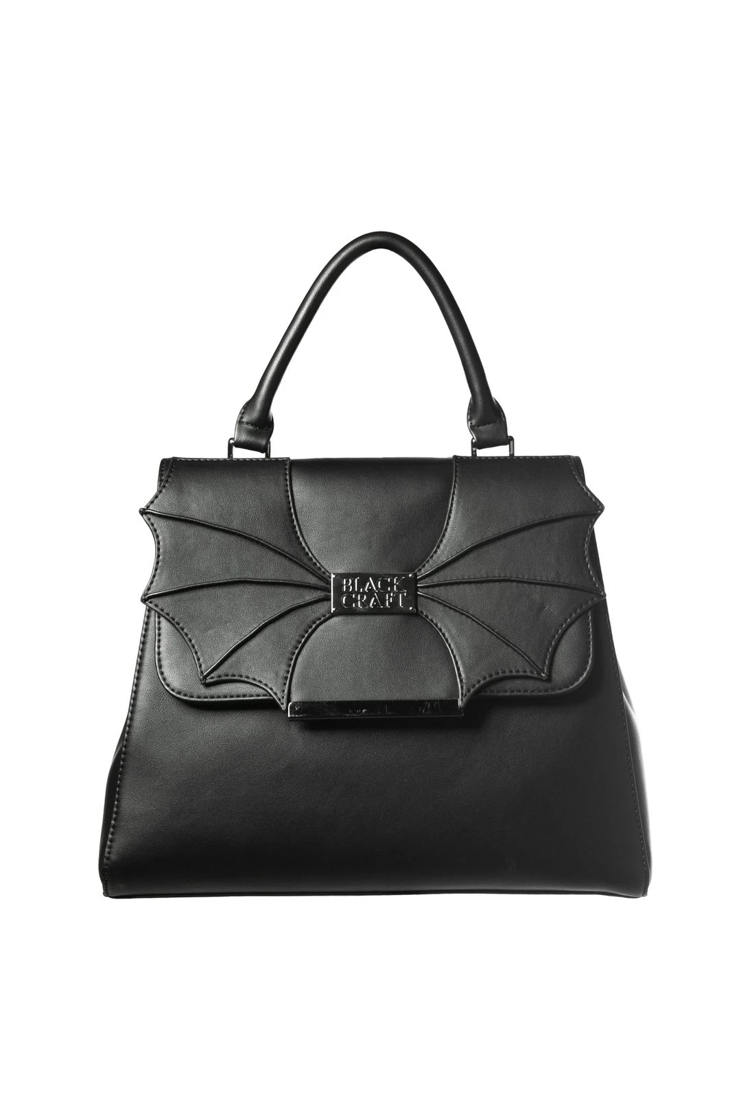 Faux leather top handle bag features bat wing detail on front flap. Gunmetal finish hardware as well as Blackcraft logo plaque. Includes detachable crossbody strap.