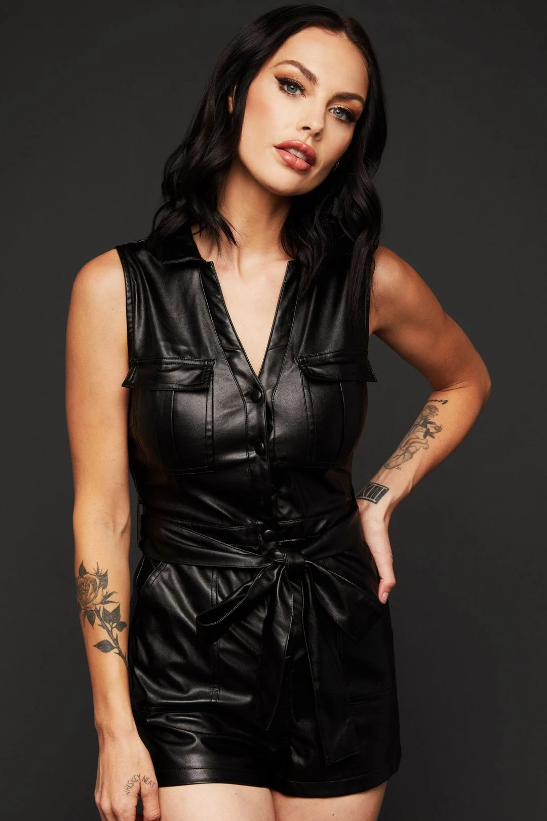Make your look pop with this black faux leather romper.