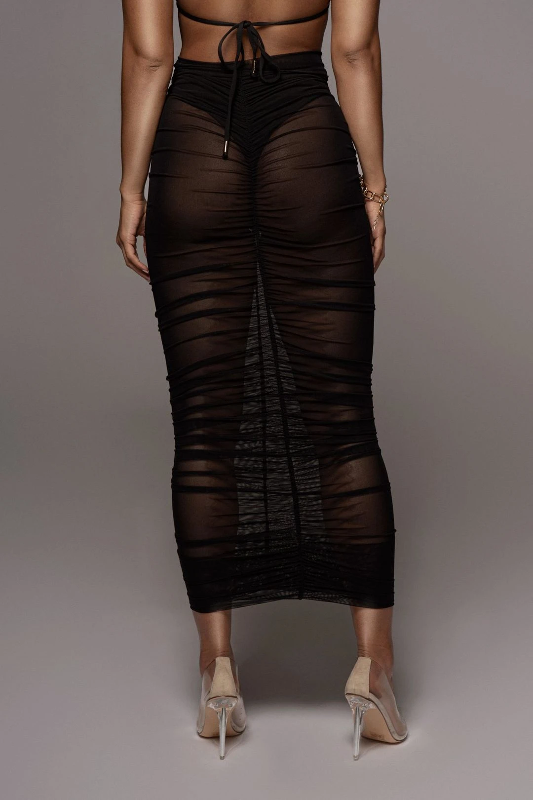 EXCLUSIVELY DESIGNED BY US FOR YOU. Take your vacation look to the next level in our MESH RUCHED COVER UP SKIRT. This sheer mesh maxi skirt features a flattering bodycon fit with ruched detailing throughout the design. A mesh cover up designed for more than just hanging by the pool. Stretchy. Single lined.