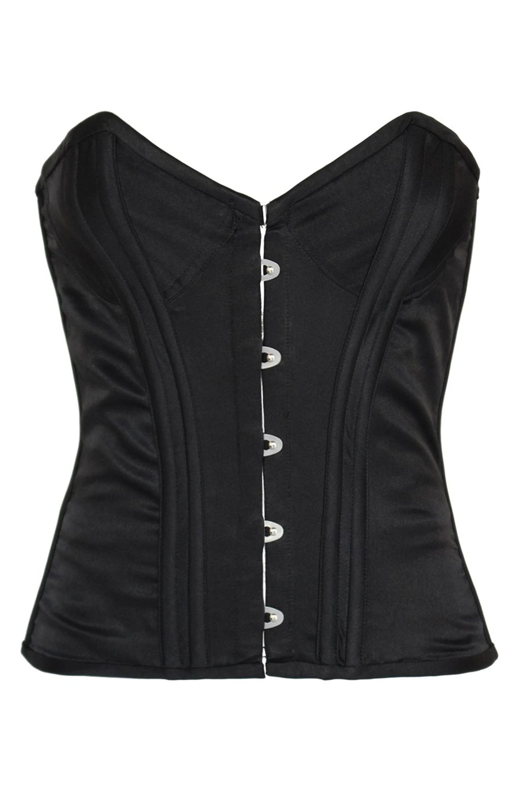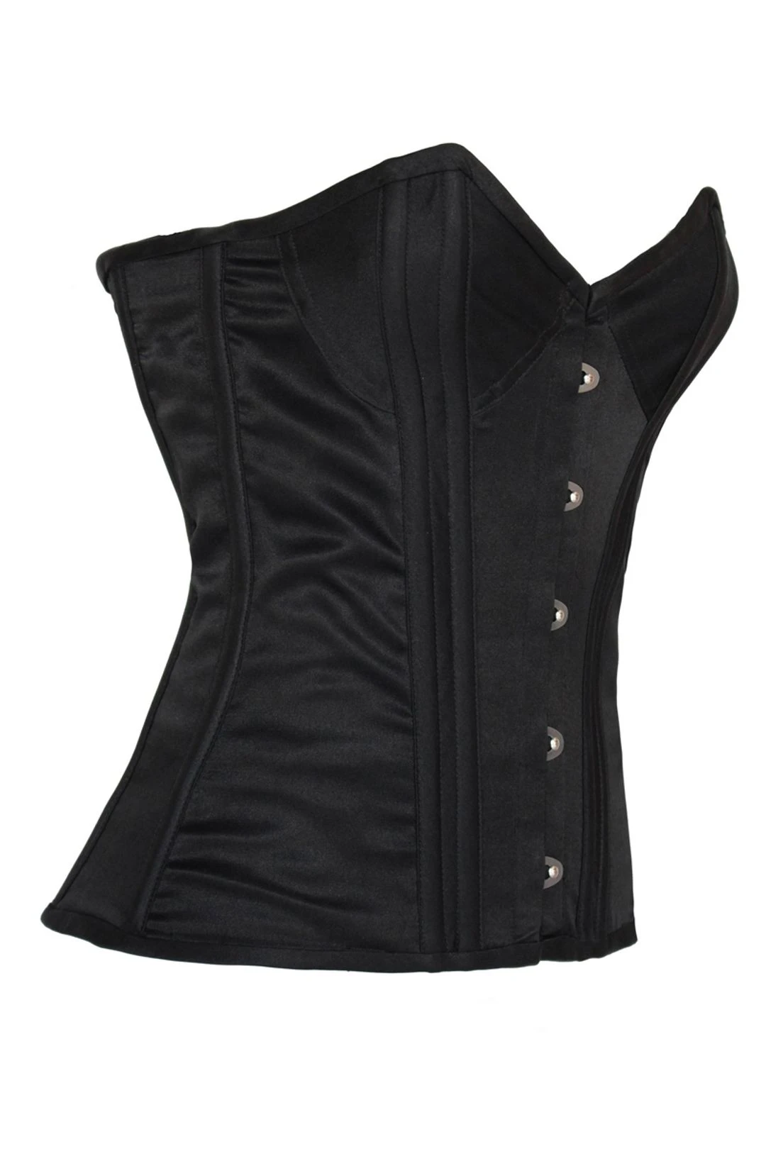 Classic black corset made with luxury black satin fabric, fully lined, hands finished with fitted back panel, detachable suspender straps, Ange dechu’s special hidden jelly pockets to enhance the bust for an extra lift