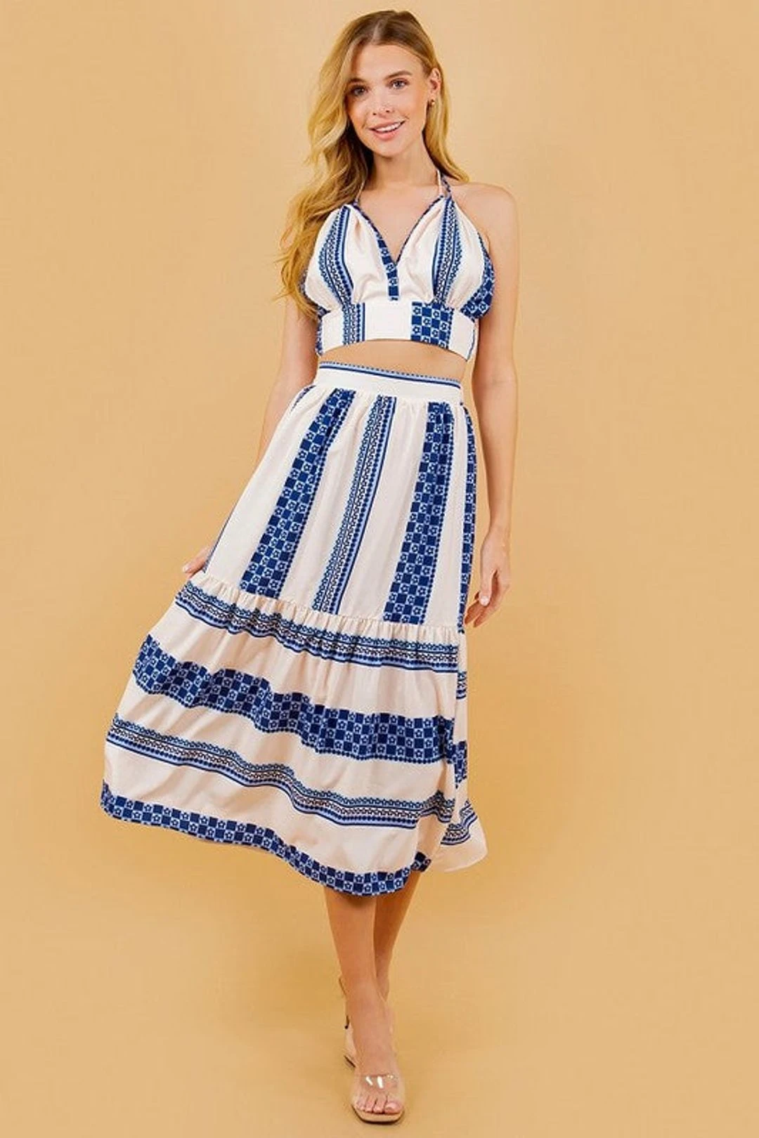 Blue floral striped midi skirt and halter crop top set