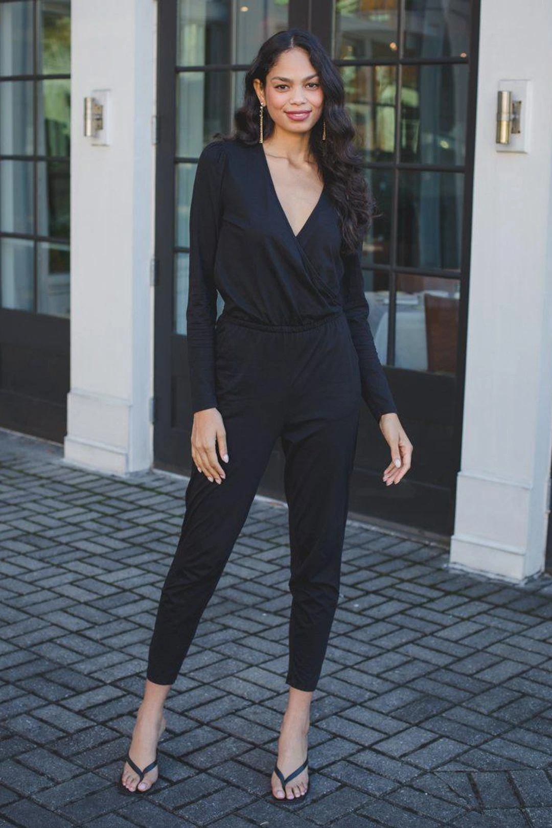 Feel the comfort and style of this one and done number from Bobi. Throw on a denim jacket or wear alone, either way.. this jumpsuit is perfect for day to night wear. Relaxed Fit. Runs true to size. Model is wearing Size S.