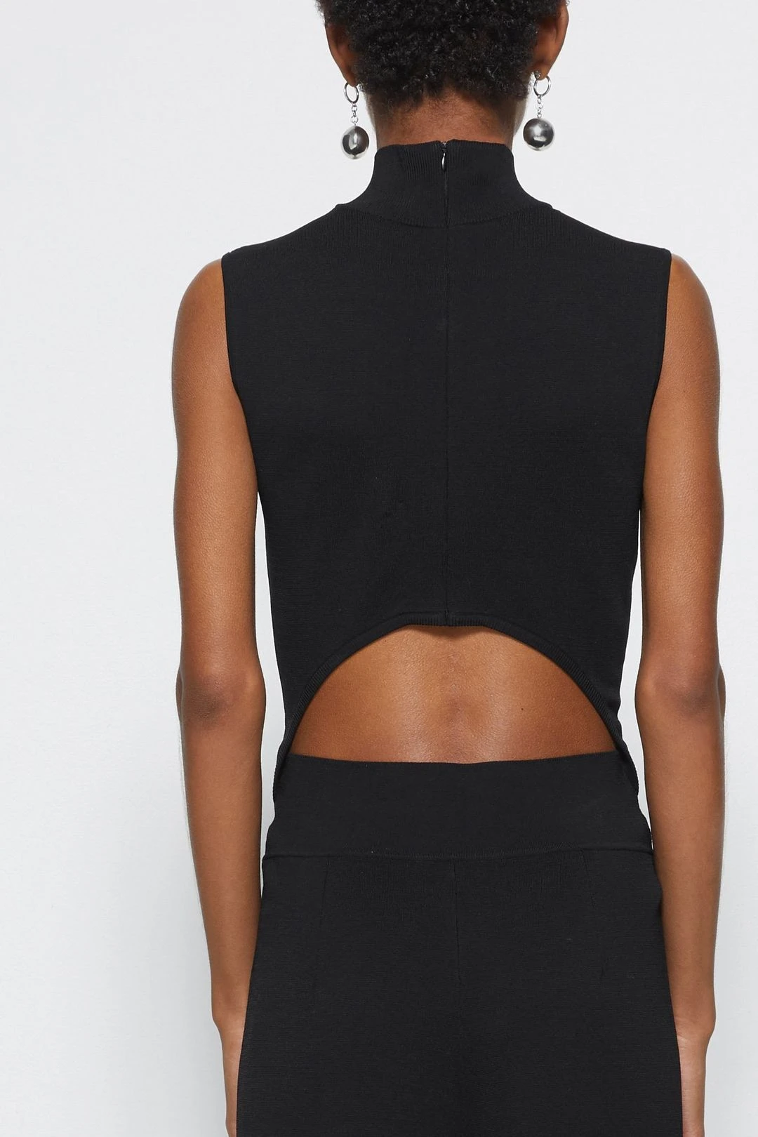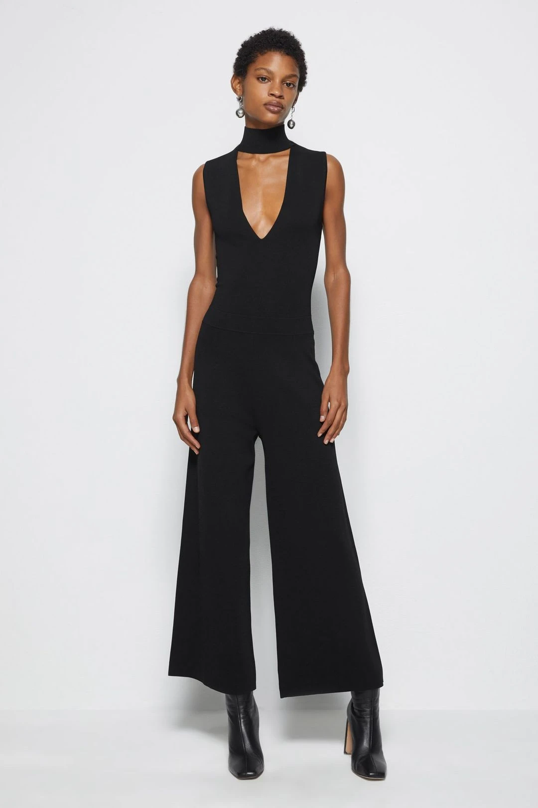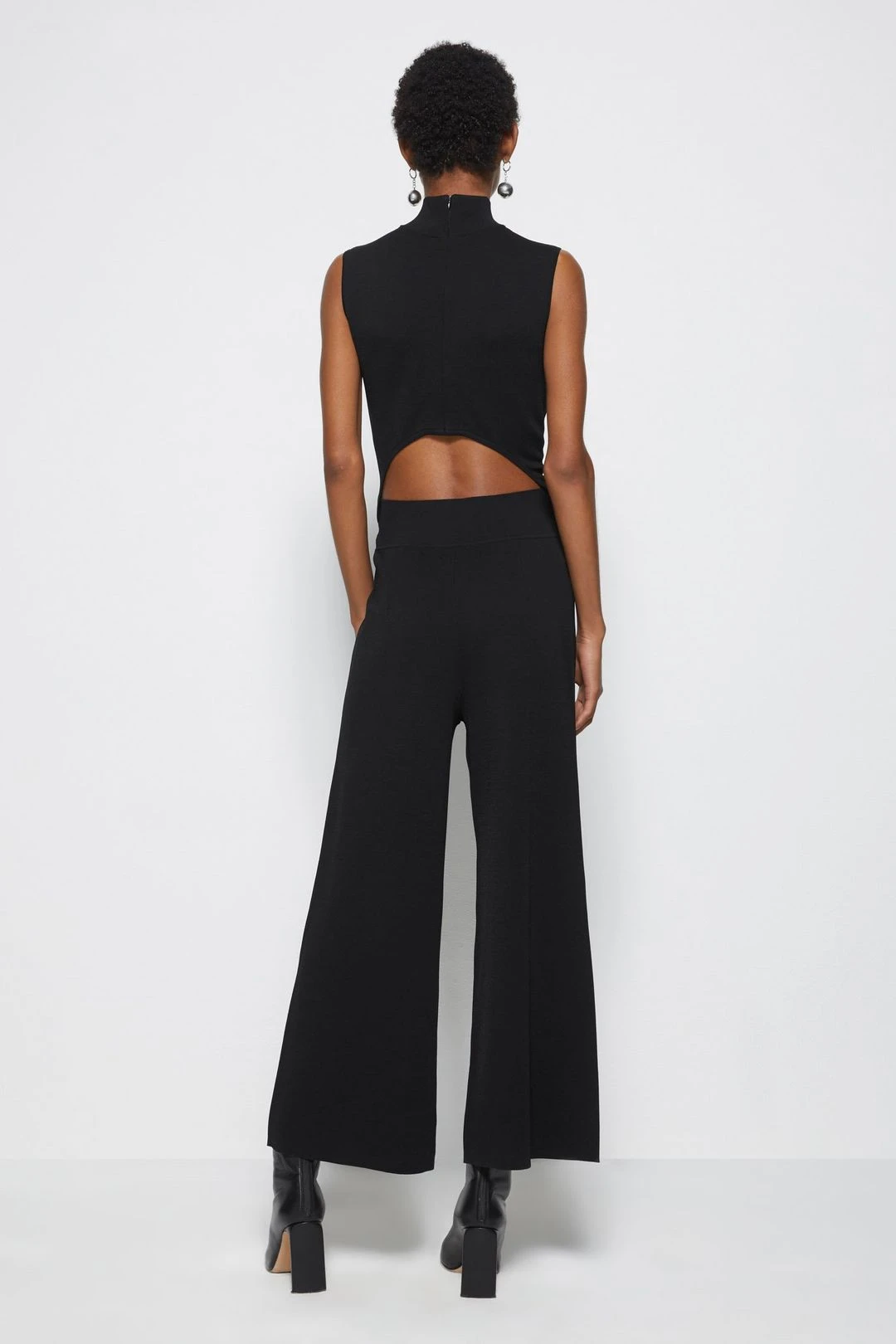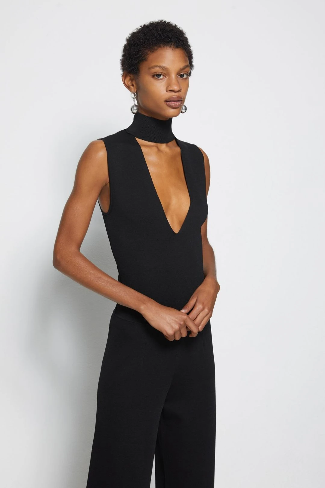 The Brenna Open Back Jumpsuit in Black. Retro inspired compact knit jumpsuit with plunging neckline, open back cutout, and wide flared leg silhouette.