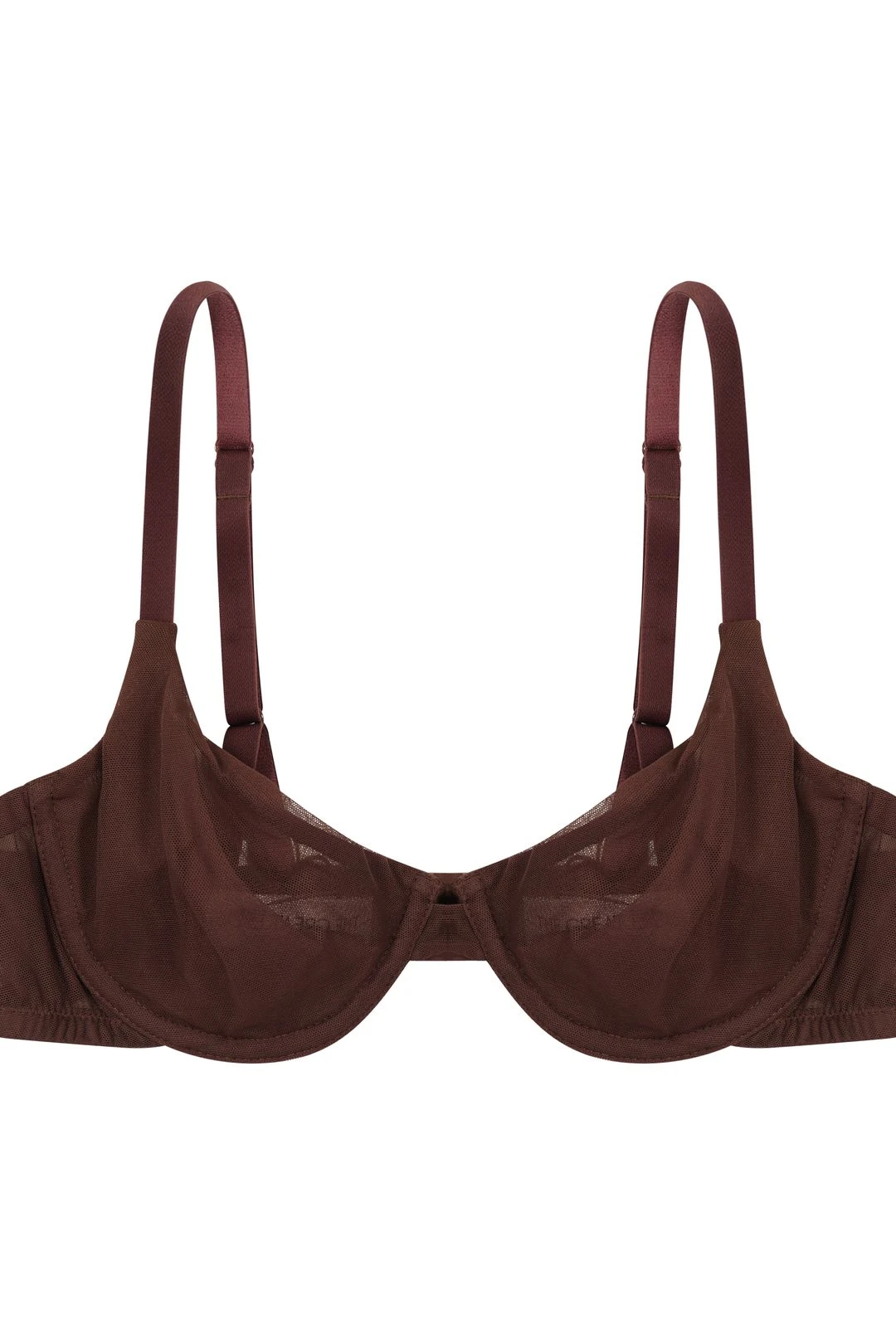 Canova Underwire Bra in Cocoa by The Great Eros. Our signature Italian double layer mesh enhanced with underwire for added support and cleavage. Adjustable straps and hook and eye closure. Excellent support up to a DD+ size. Pair it with the Canova Thong, Seamless Tenga, Ouvert or Seamless Hi Waist.