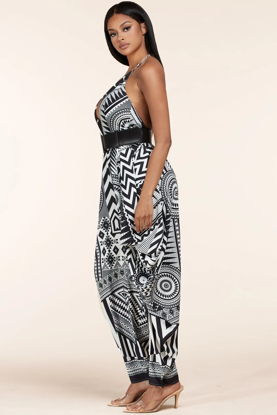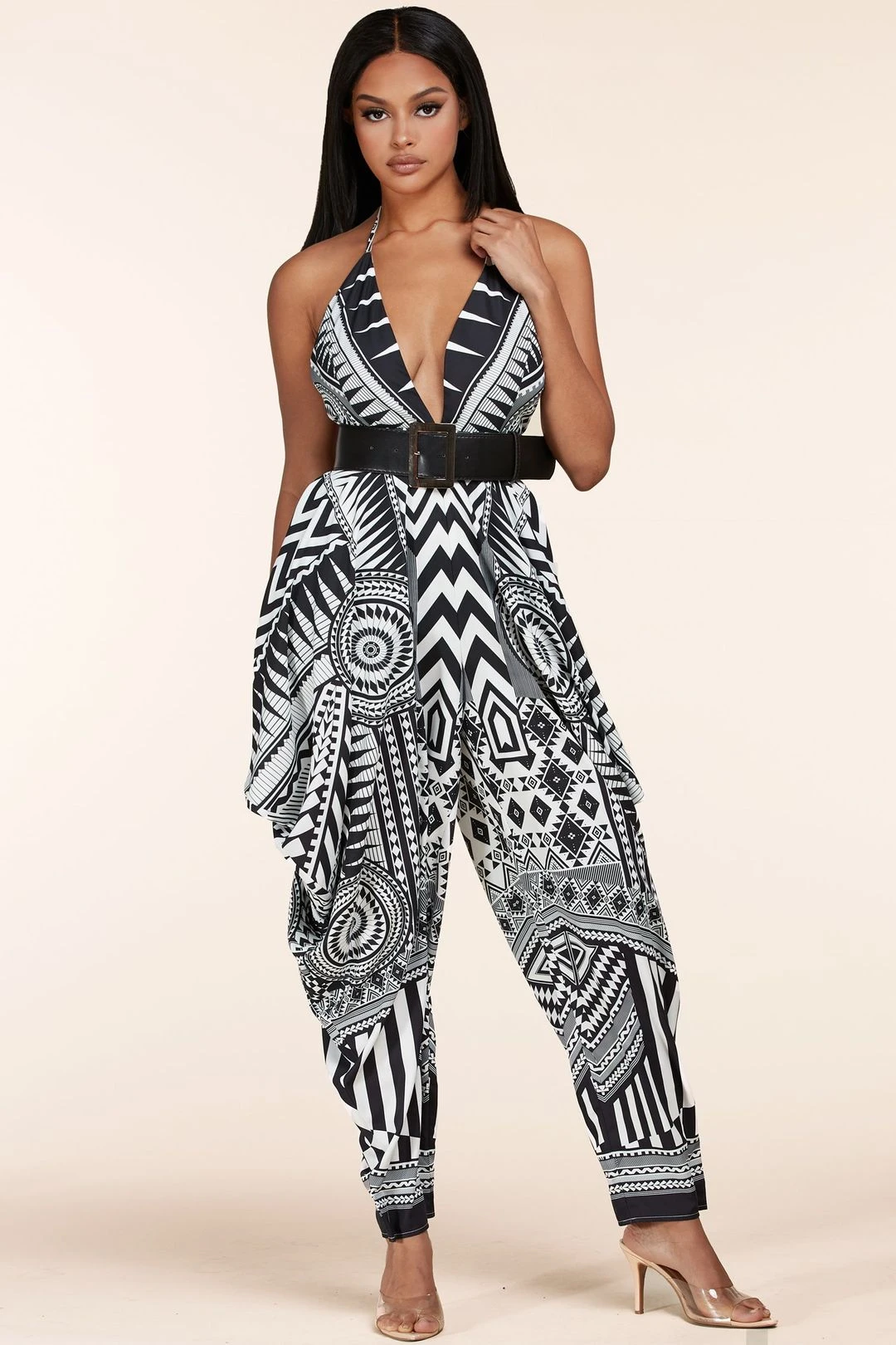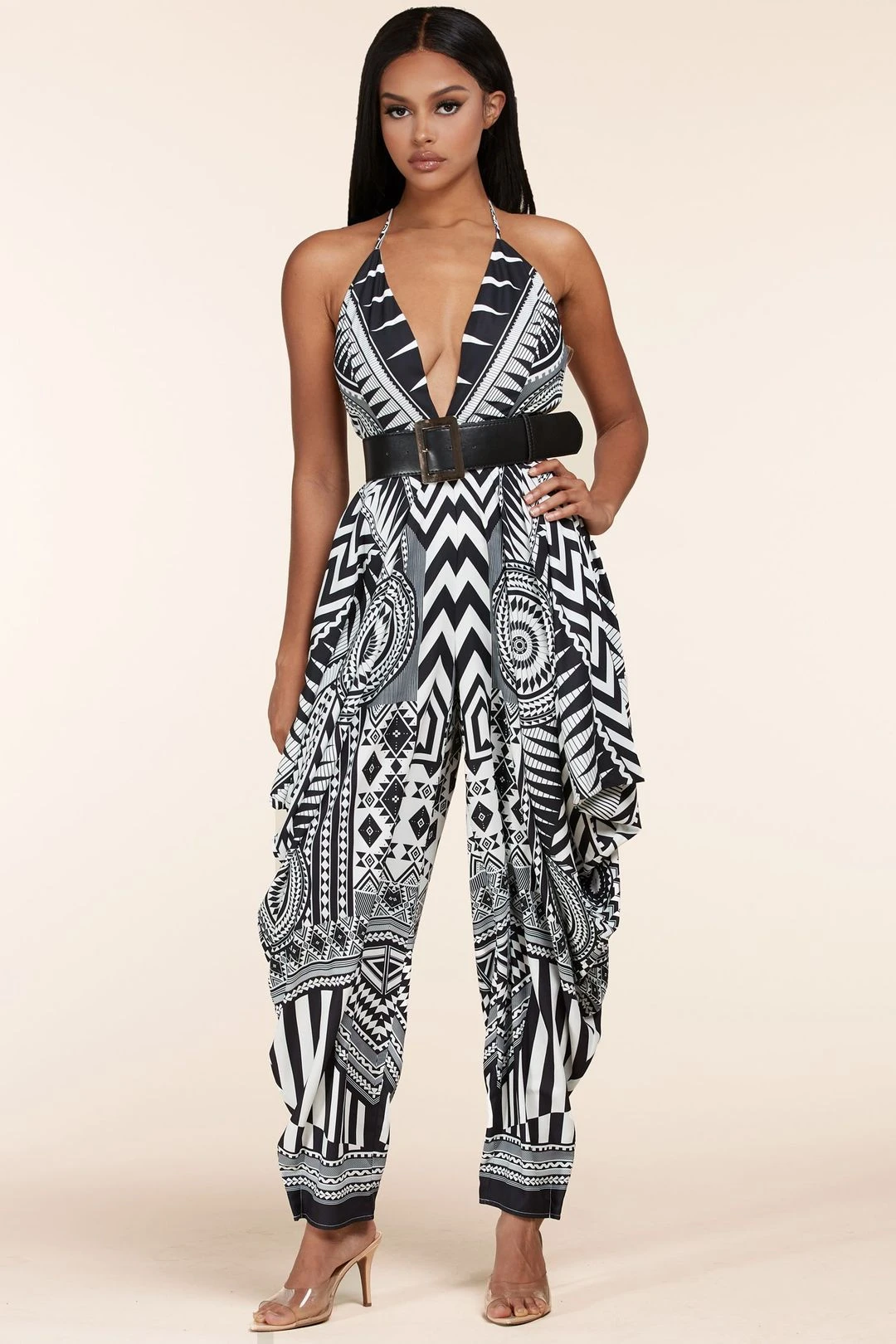 Open Back Tribal Jumpsuit with Wide Leg features a Breezy tying halter neckline and seamed bodice. This open back tribal jumpsuit with wide leg has open back tops chic, high-waisted pants with loose wide-cut legs for a breezy look. Open back tribal jumpsuit with wide leg also has a black faux leather belt cinches the waist. Open back tribal jumpsuit with wide leg is a perfect look for girls night out or a casual movie night.