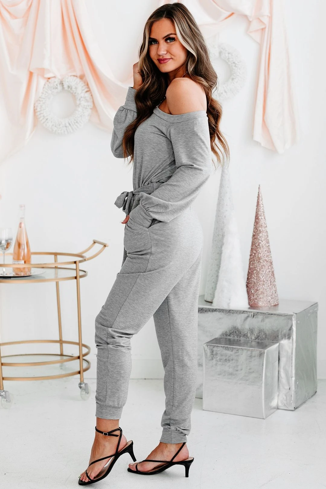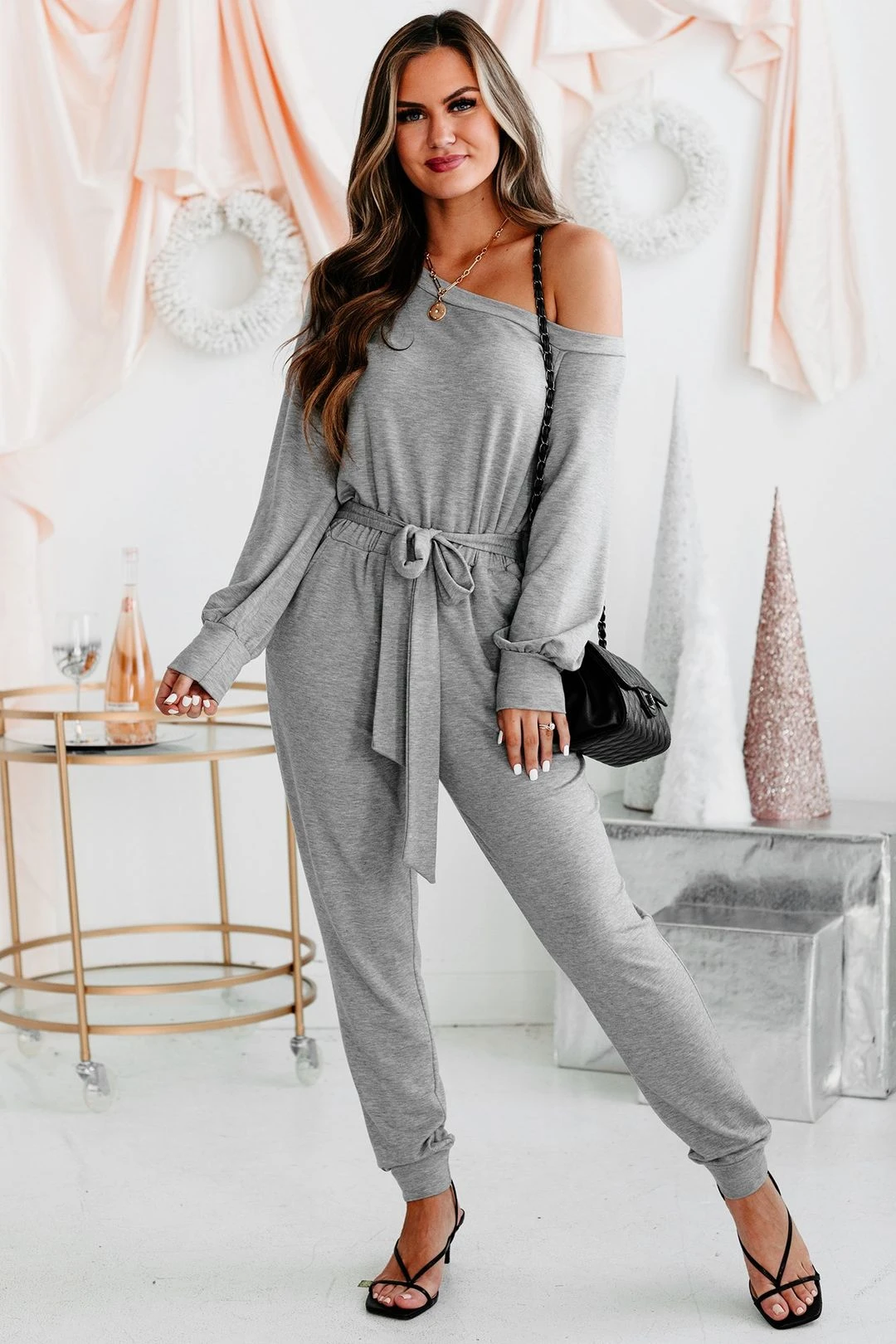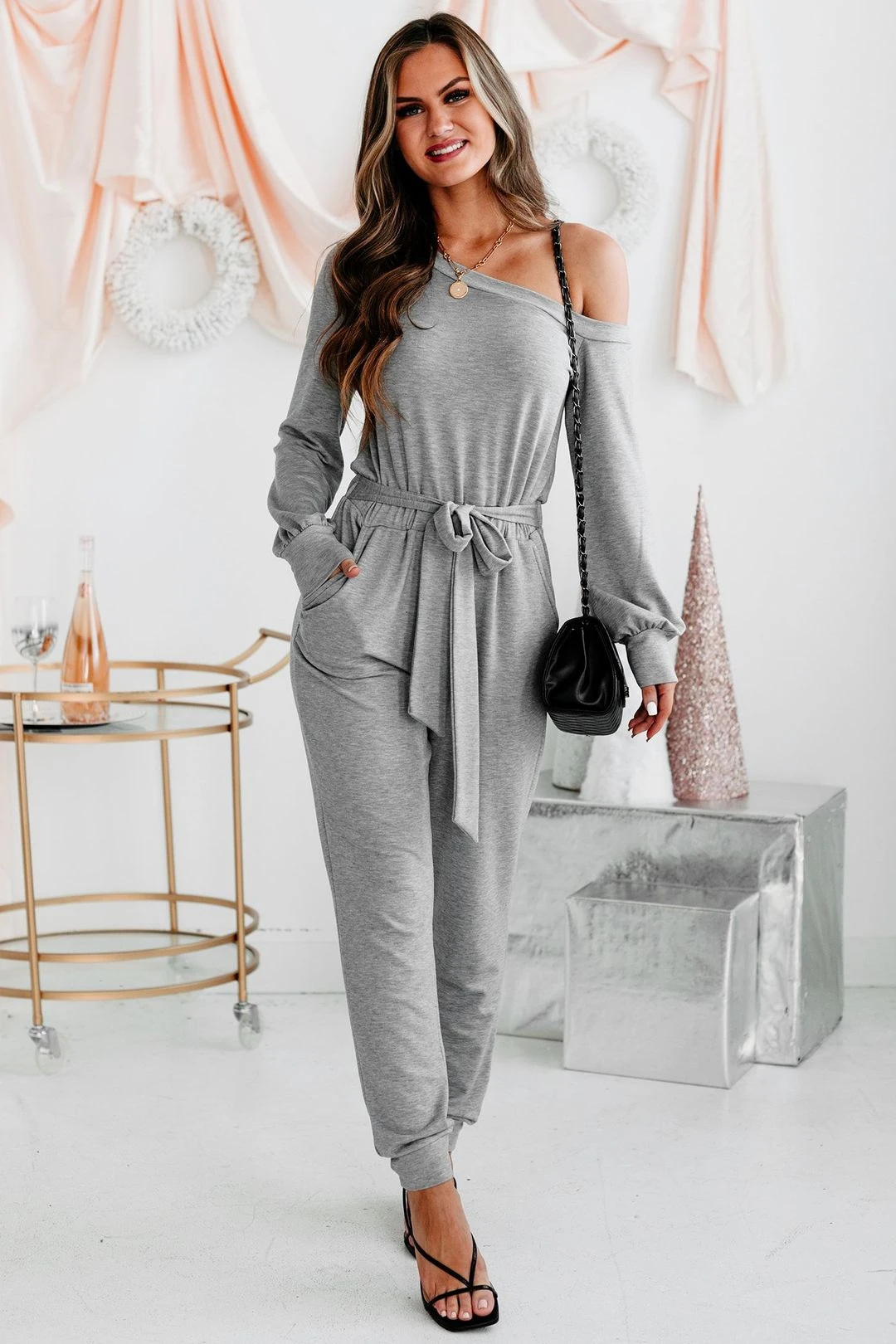 This Grey, Long Sleeved, Tie-Waist Jumpsuit Is Going To Be Your Go-To Choice For Cozy Nights & Lounge Days!