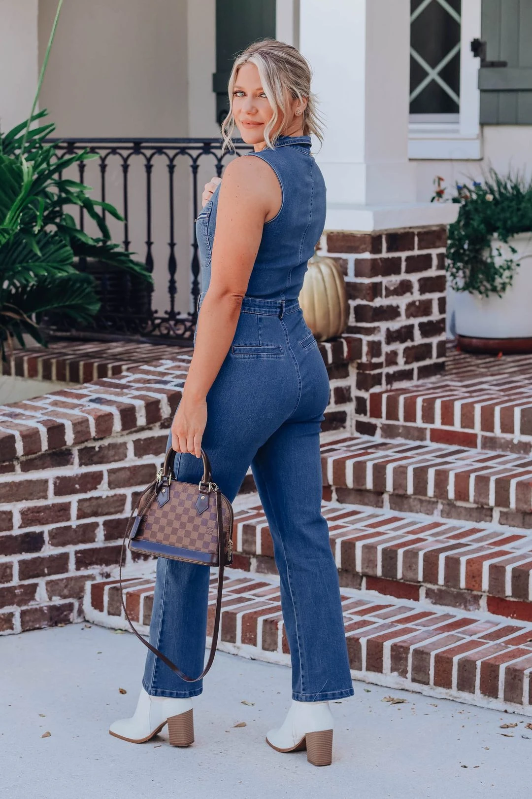 - We love a denim moment! Pair this stunning jumpsuit with white booties and a belt for a chic OOTD!!