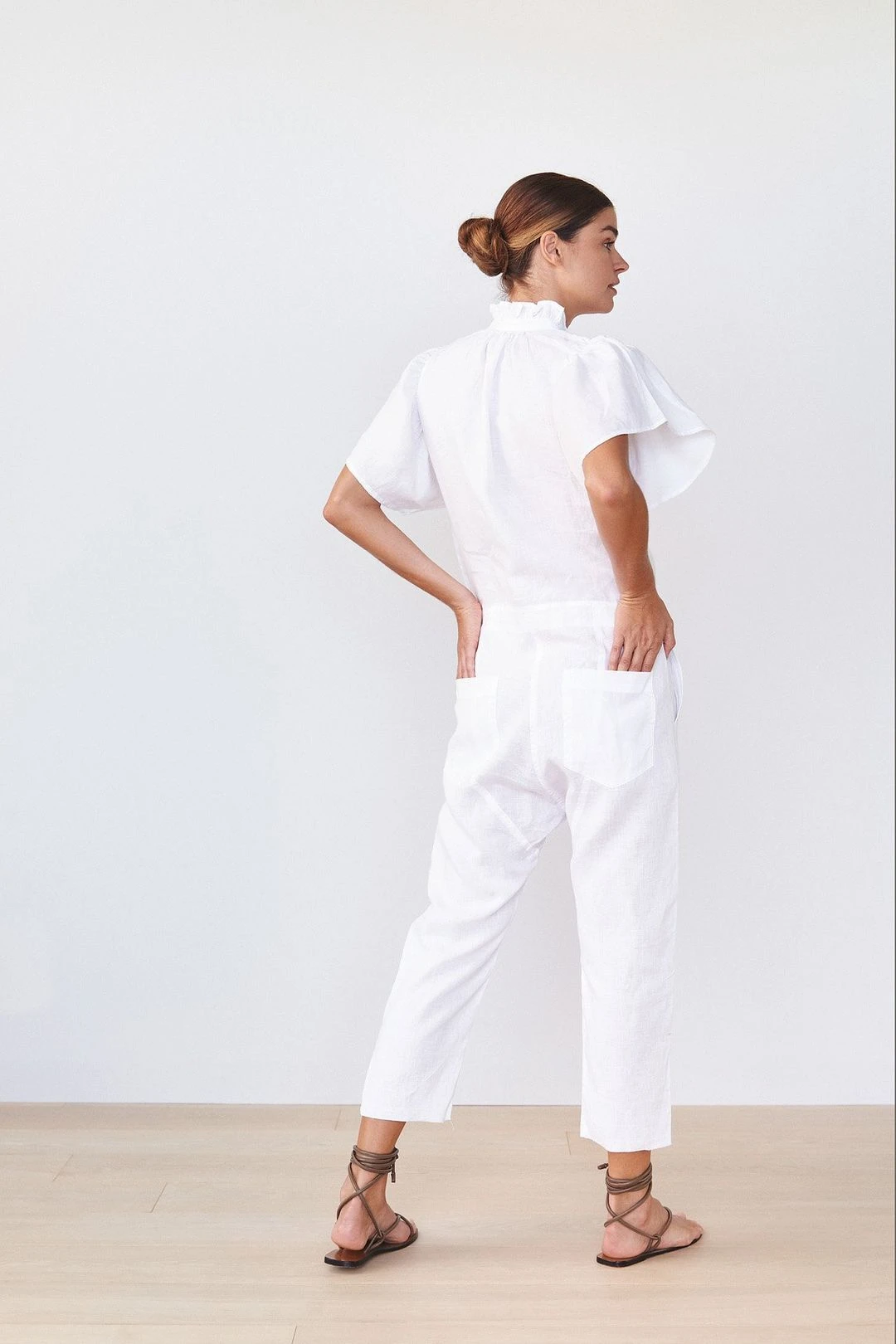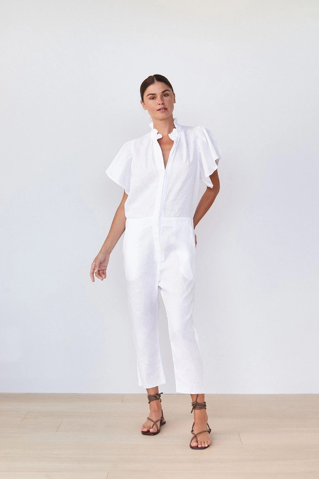 - Button down jumpsuit featuring ruffled sleeves and neckline