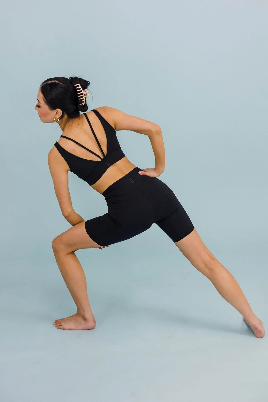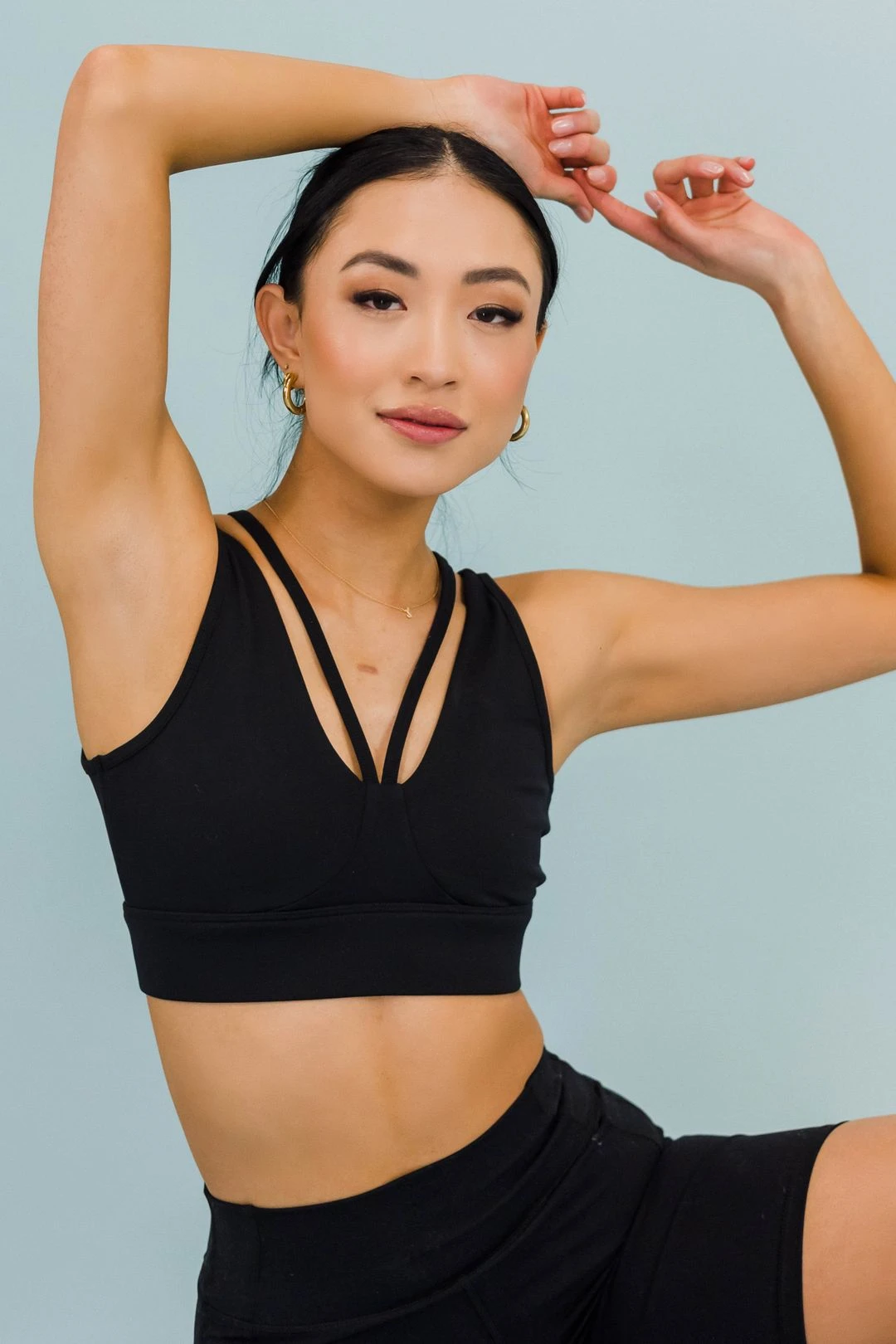 Black, double V strap top from front to back. Longline band to hold you in and beautiful seam details.