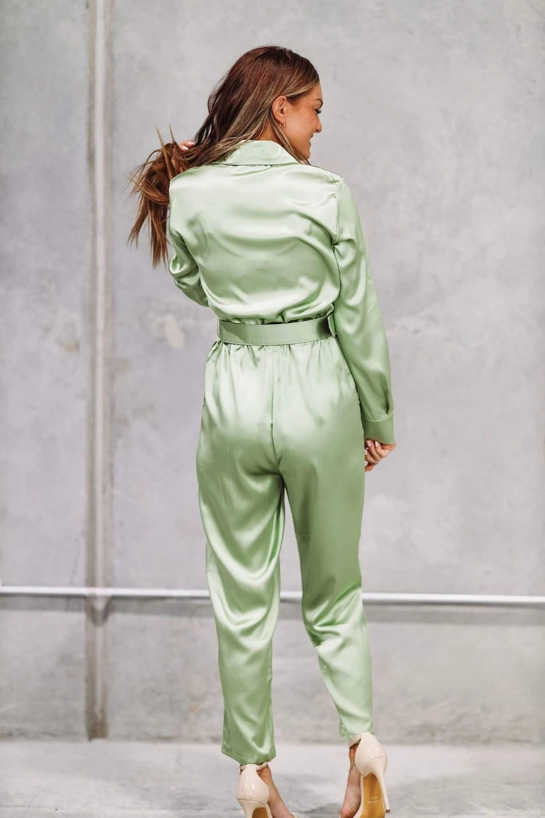 Satin jumpsuit featuring easy to fit elastic waist with adjustable belt and pockets! This flattering fit is sure to make you known for having the most trendy style!