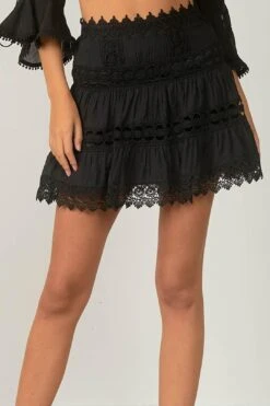 This all black eyelet skirt starts with a high waist that flows to a flared skirt. Pull on construction with elastic in the back. Pair with the matching wrap top for the perfect resort cover up. Fit is true to size. Model is wearing a size XS.