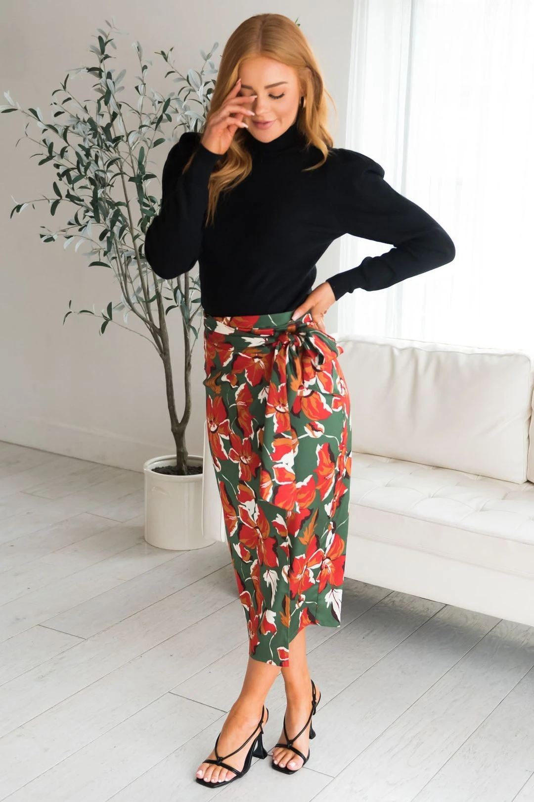 This skirt will easily take you from season to season with ease! It will be just the addition needed for every wardrobe! This darling floral paired with the satin material and wrap style, it the perfect find, click add to cart now!Â