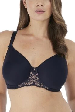 “Enjoy uncompromising support with Fantasie’s Aubree Spacer Moulded Bra, featuring lightweight, breathable cups that offer full coverage and a flawlessly smooth silhouette. Decorated with beautiful two tone lace against a dark Navy base for a complementary contrast. A diamanté tear drop charm completes the look. Available in up to an H cup.”