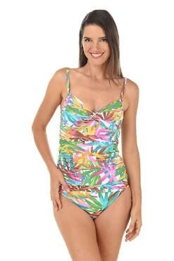 The twisted front and fun tropical leaf pattern define this Bleu By Rod Beattie tankini top. With side shirring and supportive underwire, this tankini top will fit and flatter your figure and leave you feeling confident.