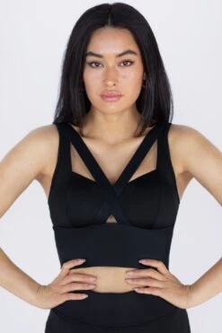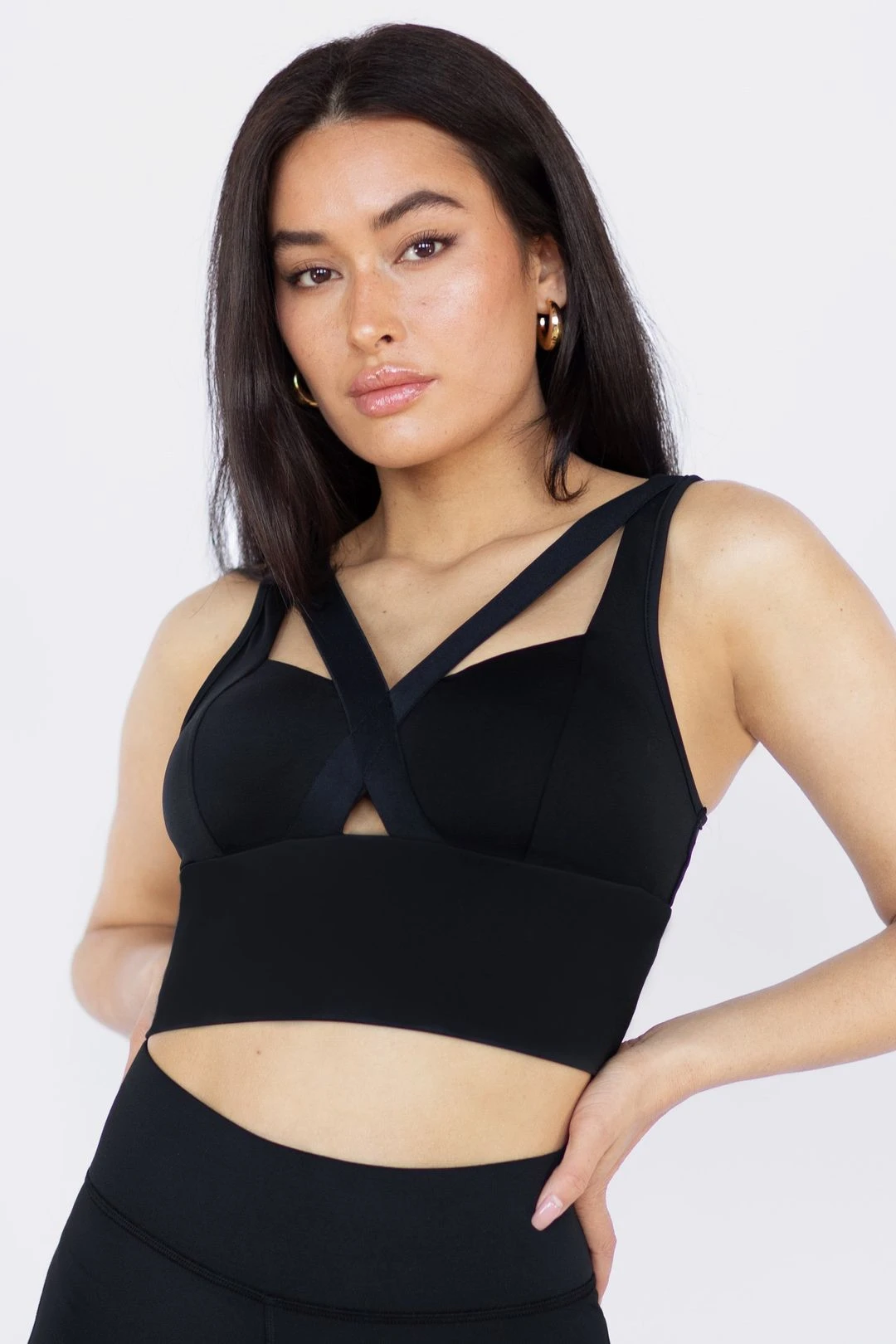Bondage-inspired performance bra with supportive elastic straps and a ventilating cut-out, made in next-to-skin soft fabric.