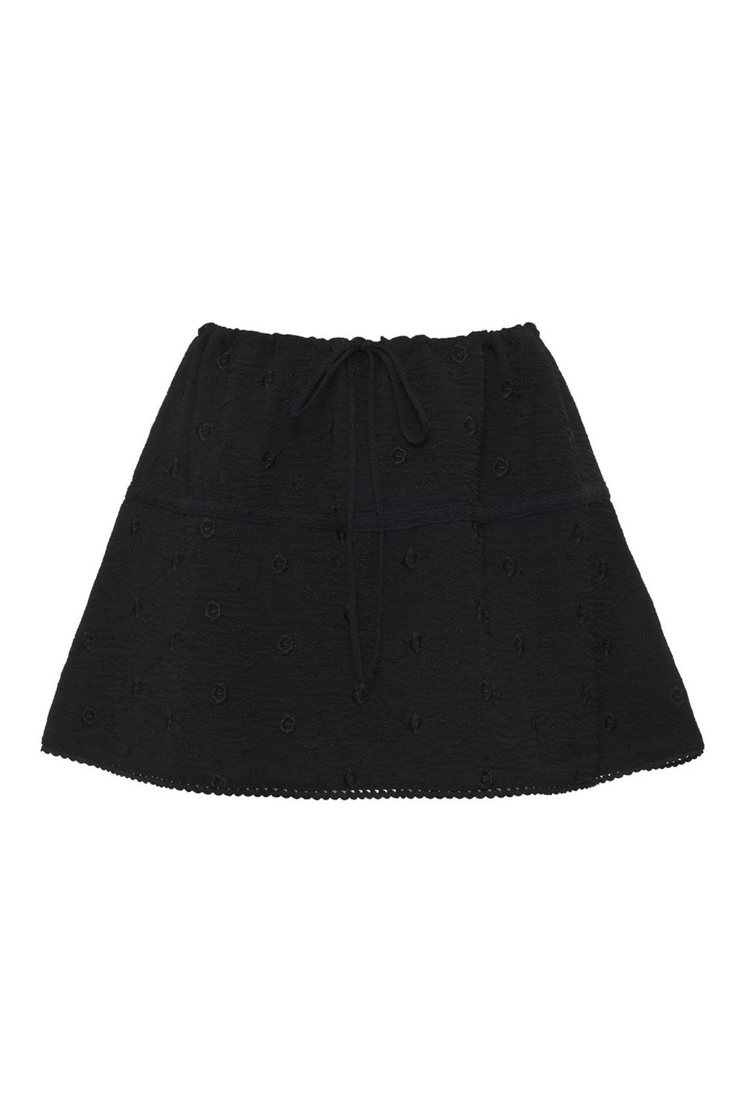 Introducing Anabelle, a mini skirt in our first-of-its-kind black eyelet fabric. Anabelle is designed with a tie at the waist and lace trim details. Pair this mini skirt with the matching Anabelle long sleeve shirt or a cute white tank.