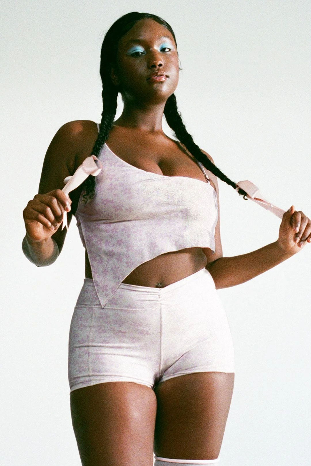 An on-trend, floral sports bra that doubles as a top, meet Lydia. Lydia is designed with an asymmetrical cut, adjustable straps, the softest, recycled polyester fabric, and our signature Frankies Bikinis activewear logo. Wear the Lydia sports bra with the Rehearsal short for any workout, or with a pair of blue jeans for any sunny outting.