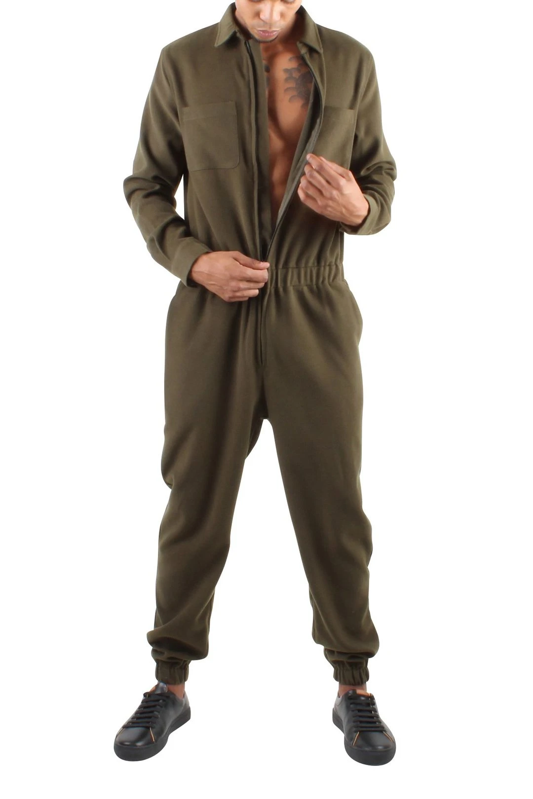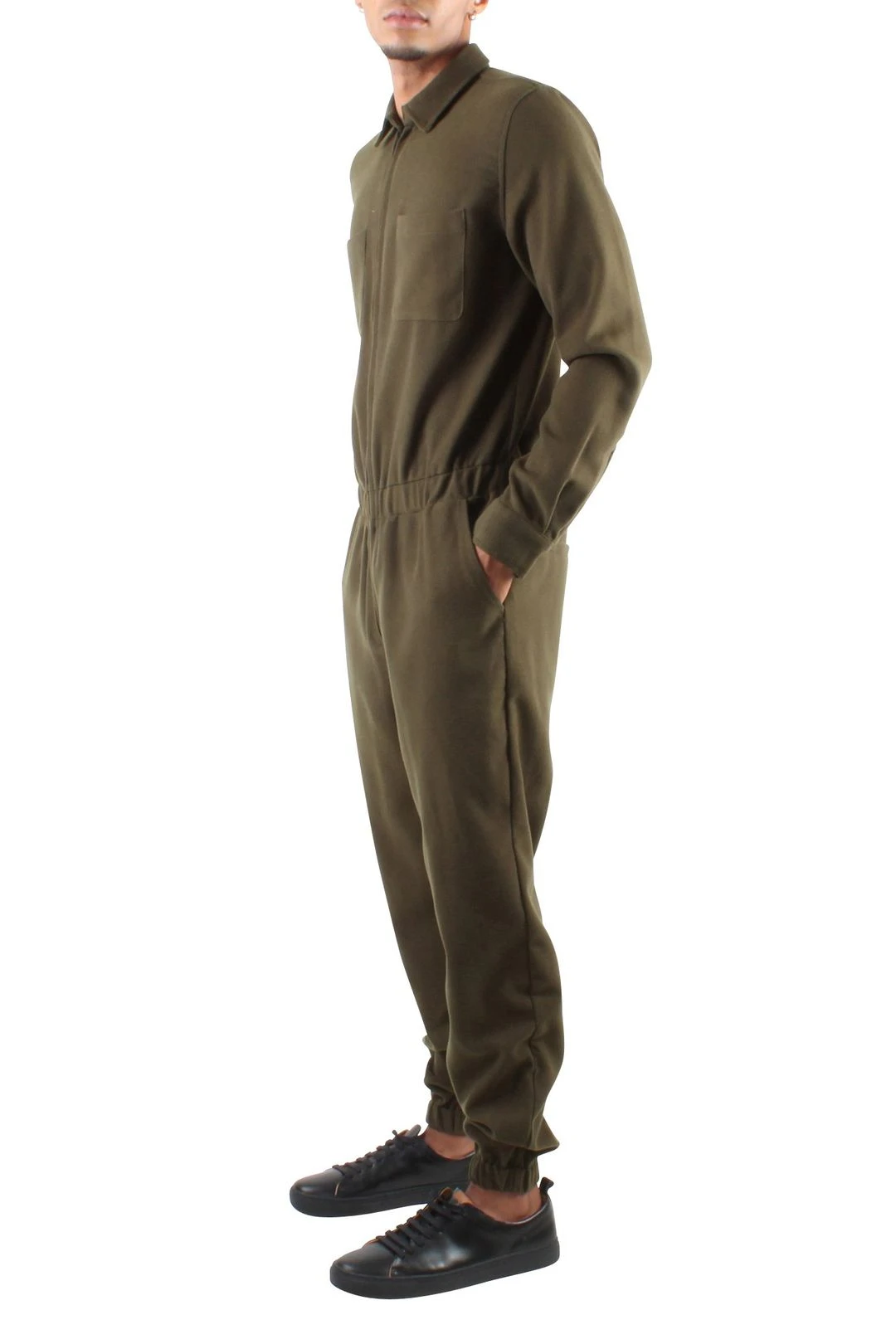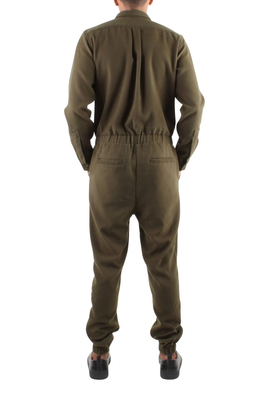 Long sleeve wool jumpsuit. Full front zip, chest pocket, side and back pockets, button closure at sleeve and elastic ankles. You can’t go wrong with this jumpsuit — it’s a studio favorite.