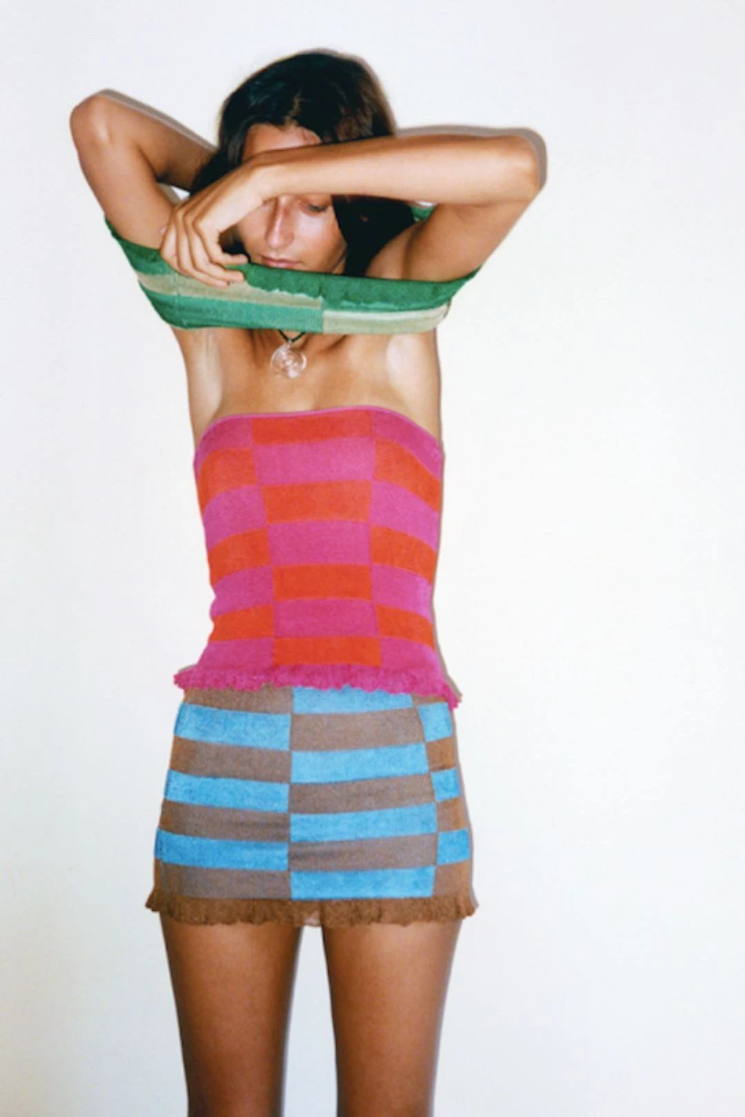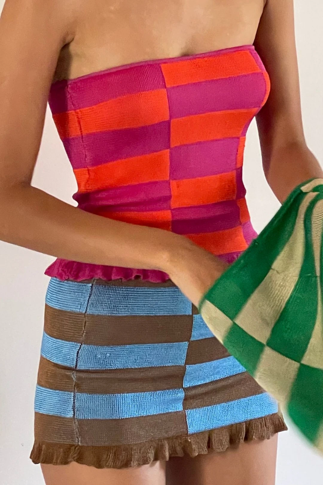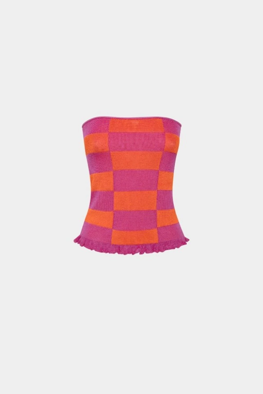 These two-toned tube tops are something you need in your closet! It’s shaped from a lightweight knit to a streamlined silhouette with a strapless neckline. Comes with a frill on the bottom for an extra touch! Pair with the complementing trousers for a full look, or it can even be worn as a skirt. Extremely delicate big carefully with jewellery, nails and sharp edges.