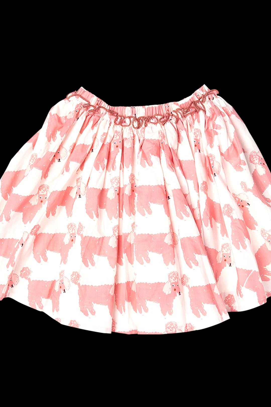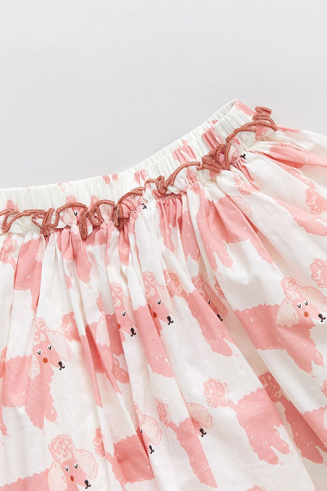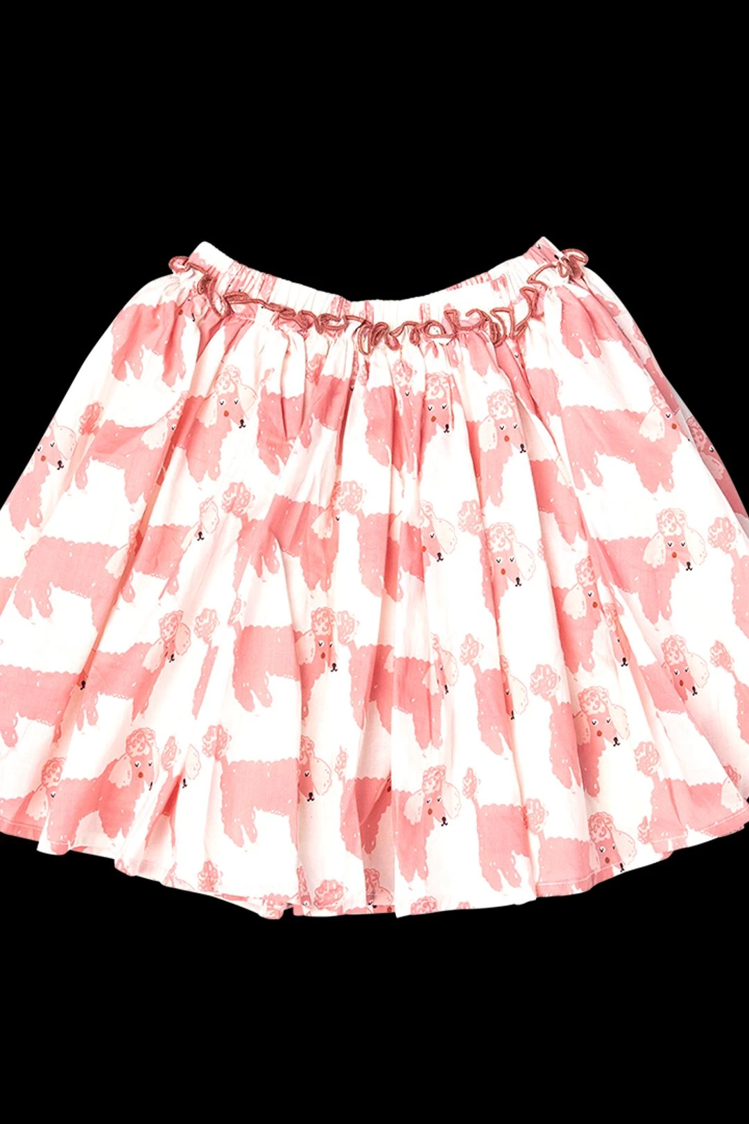 Puppy Love. We can hardly contain our excitement about our continued collaboration with British artist Darcie Olley who shares our enduring love of doggos. A parade of precocious pink pups prance across our Girls Gianna Skirt in our cheeky Poodle Party print. Cleverly styled details include a rust ruffle trim at the elastic waist. Fully gathered and fully lined.