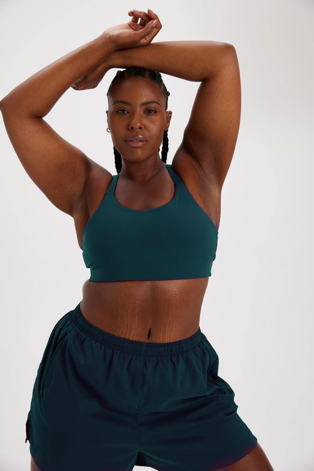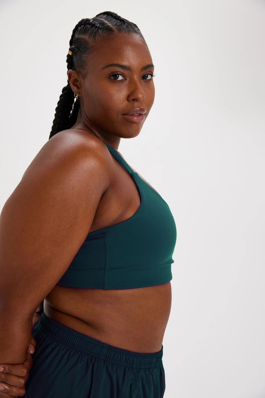 A supportive, full coverage sports bra with recycled, removable cups and clean, minimal straps for a barely-there feel.