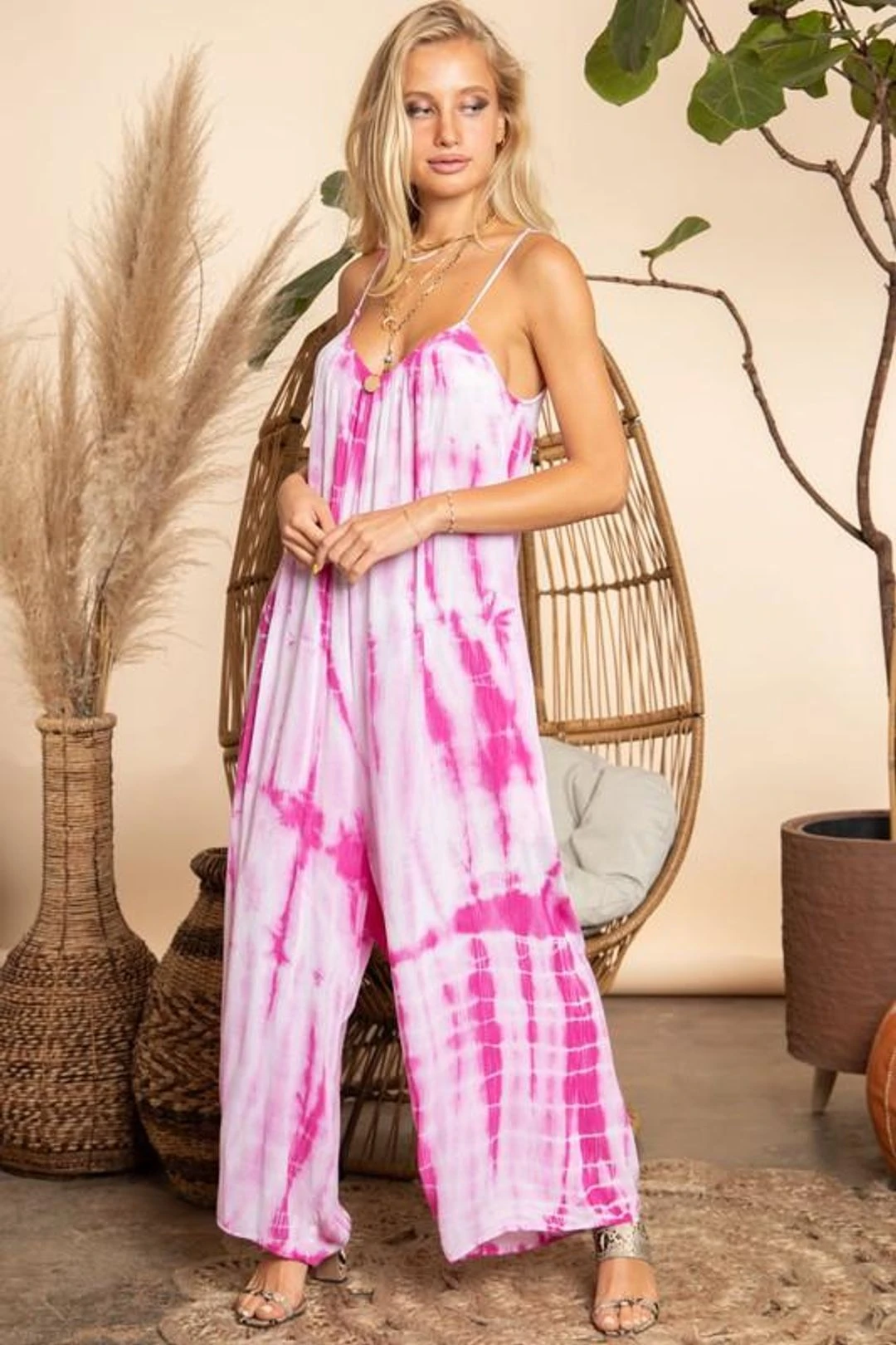 The cutest jumpsuit! We love the bright color and the tie dye pattern. It features adjustable straps and pockets.