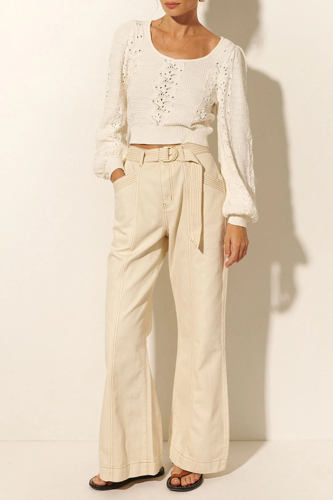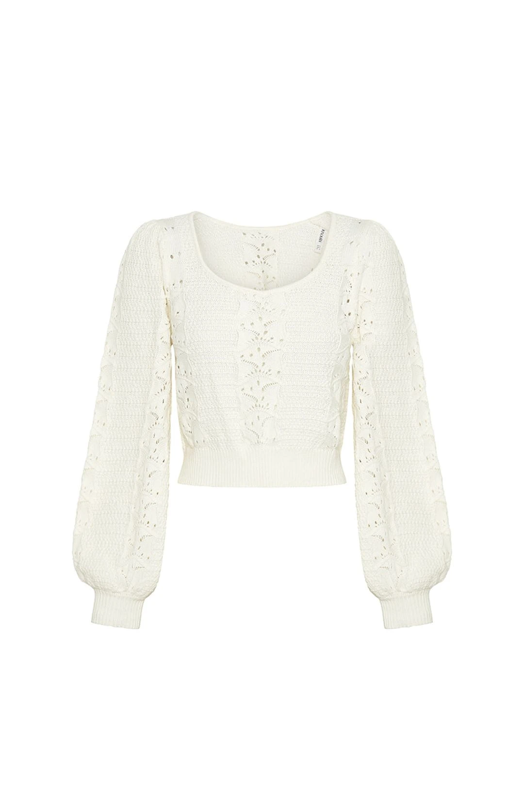 The Helena Knit Top is designed with a cable knit and pointelle stitching detail in a fitted cropped silhouette that can be worn reversed, featuring full-length sleeves and finished with a ribbed hem and cuffs.