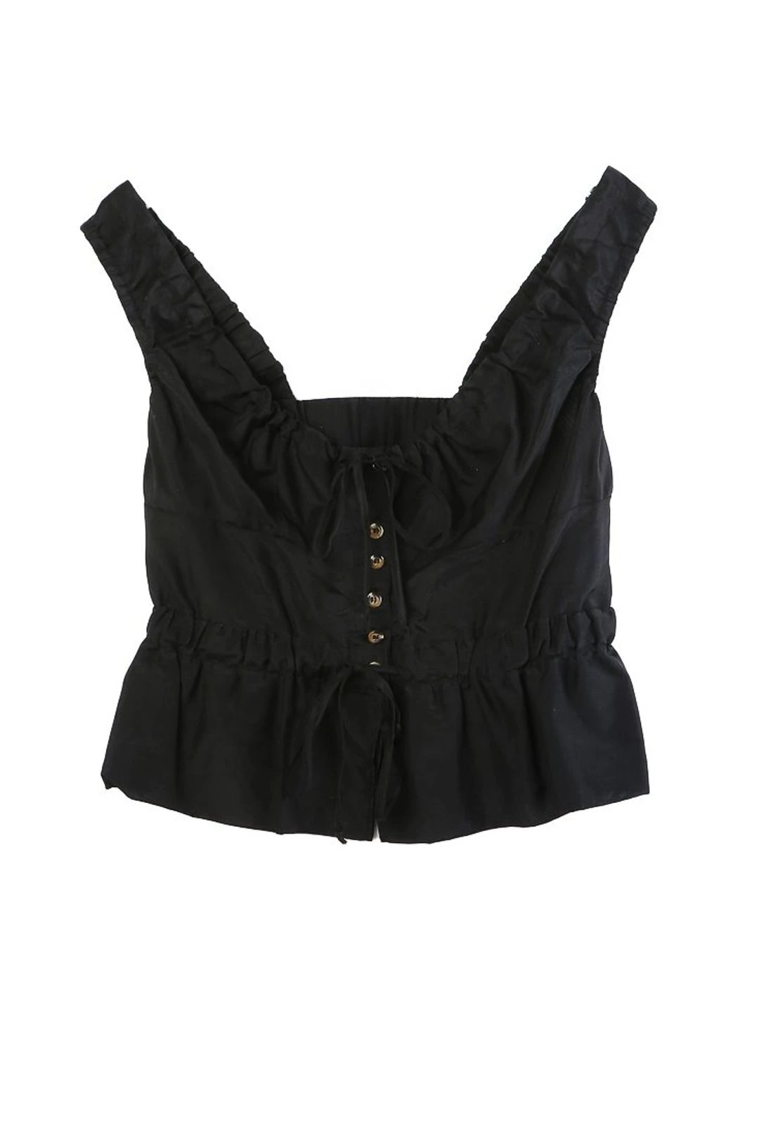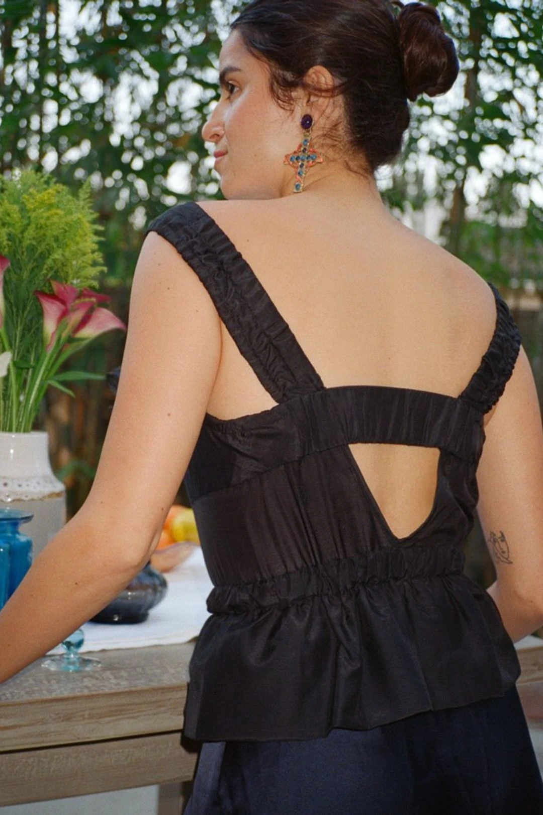 The Ilaria top in black is a cotton semi-off the shoulder blouse with a button down closure and two ties at the bust and waist. Pair it with the Carlotta skirt in Midnight!