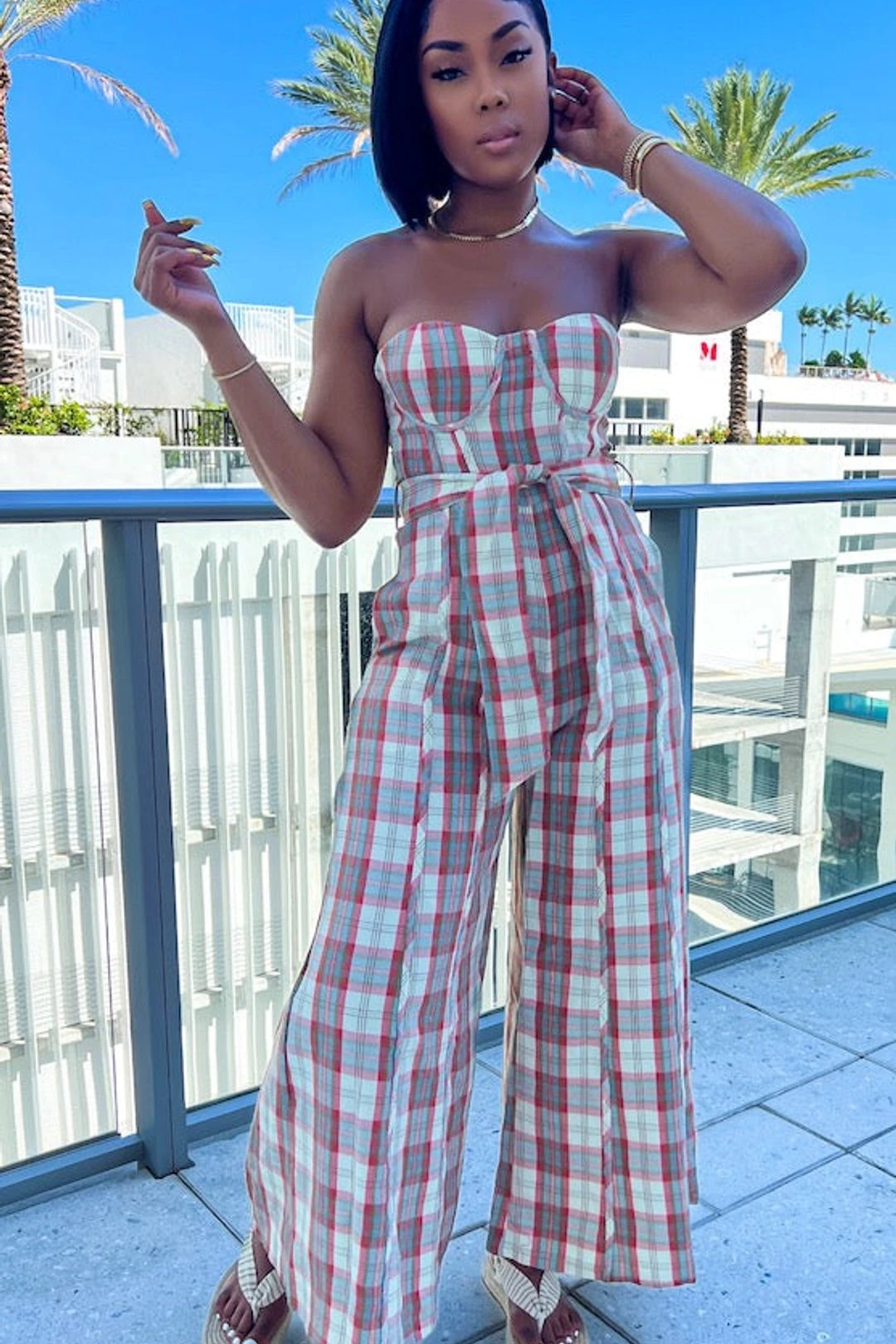 How cute is this plaid culotte jumpsuit. Features a sweetheart neckline, removable adjustable straps, has pockets, comes with belt and back zipper closure.Â