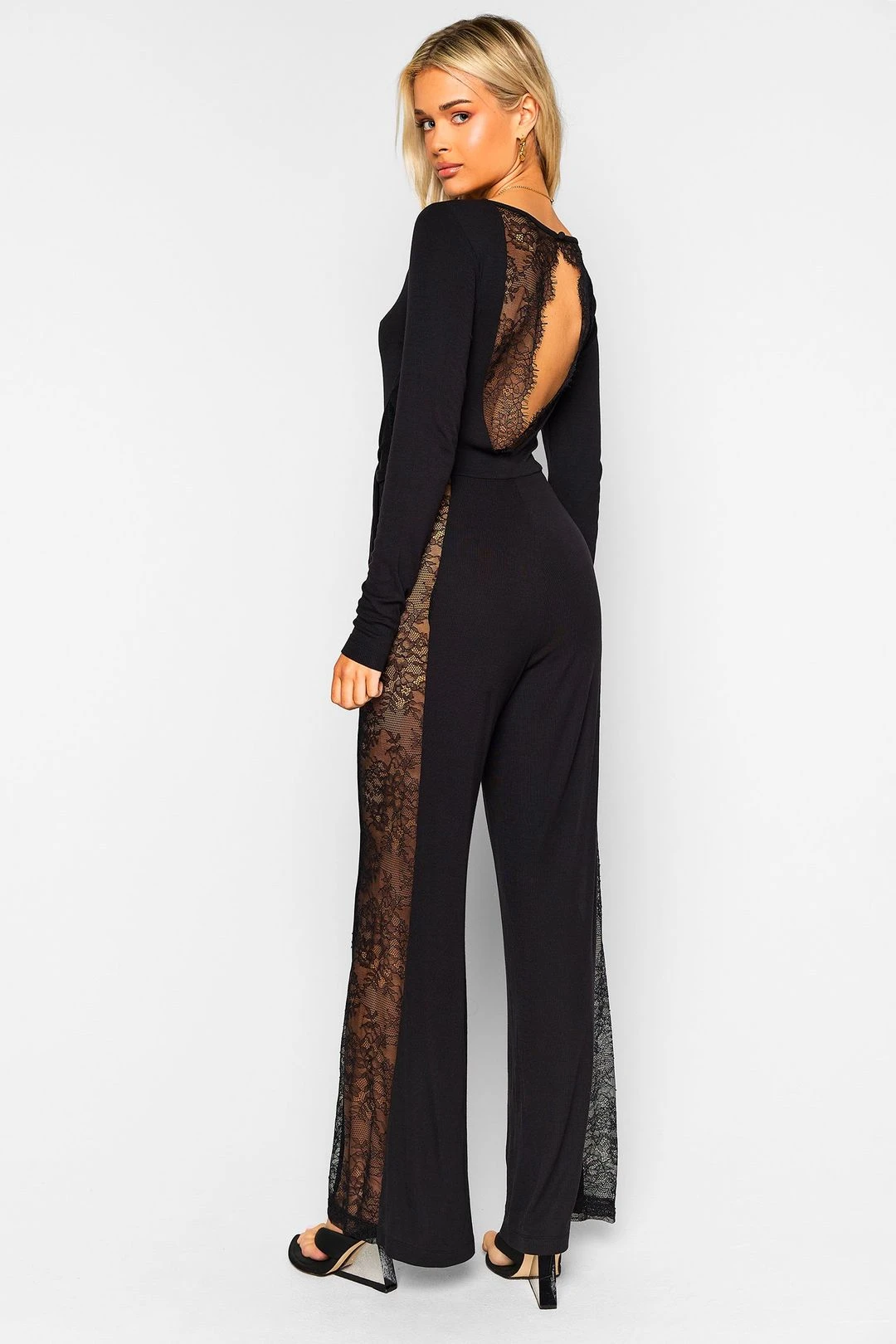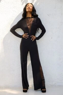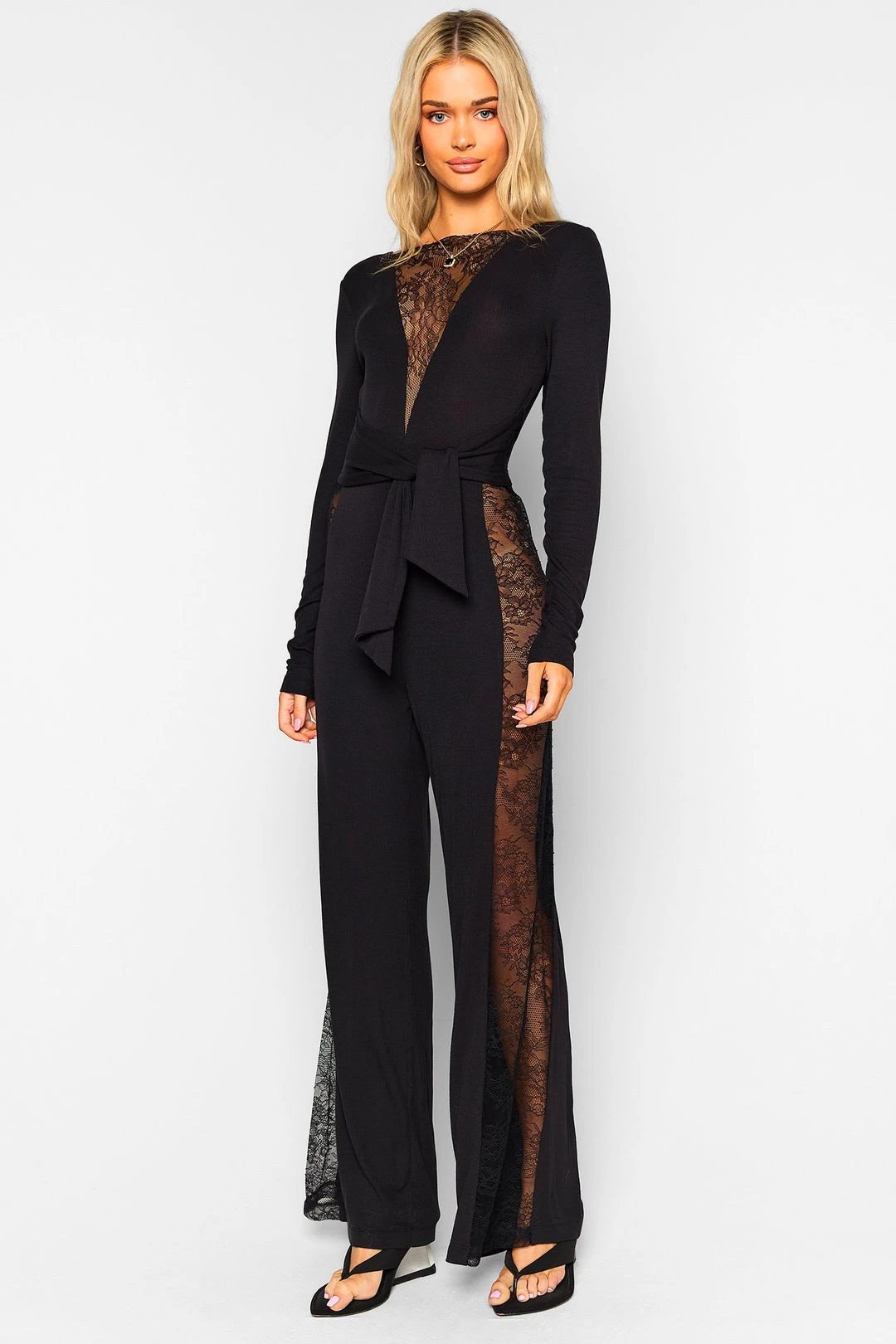 The Lizzie Jumpsuit has a deep V-neck, features gorgeous lace panels and ties at the front or back.