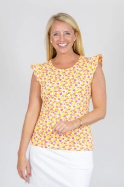This Jojo top is everything you’ve been looking for with quiet luxury and practical details. The flirty shoulder ruffle adds fun and a tailored look to our American made top. Brightly colored in our summery field of dahlias print. American Made. Model is 5’7 and wearing a size small.