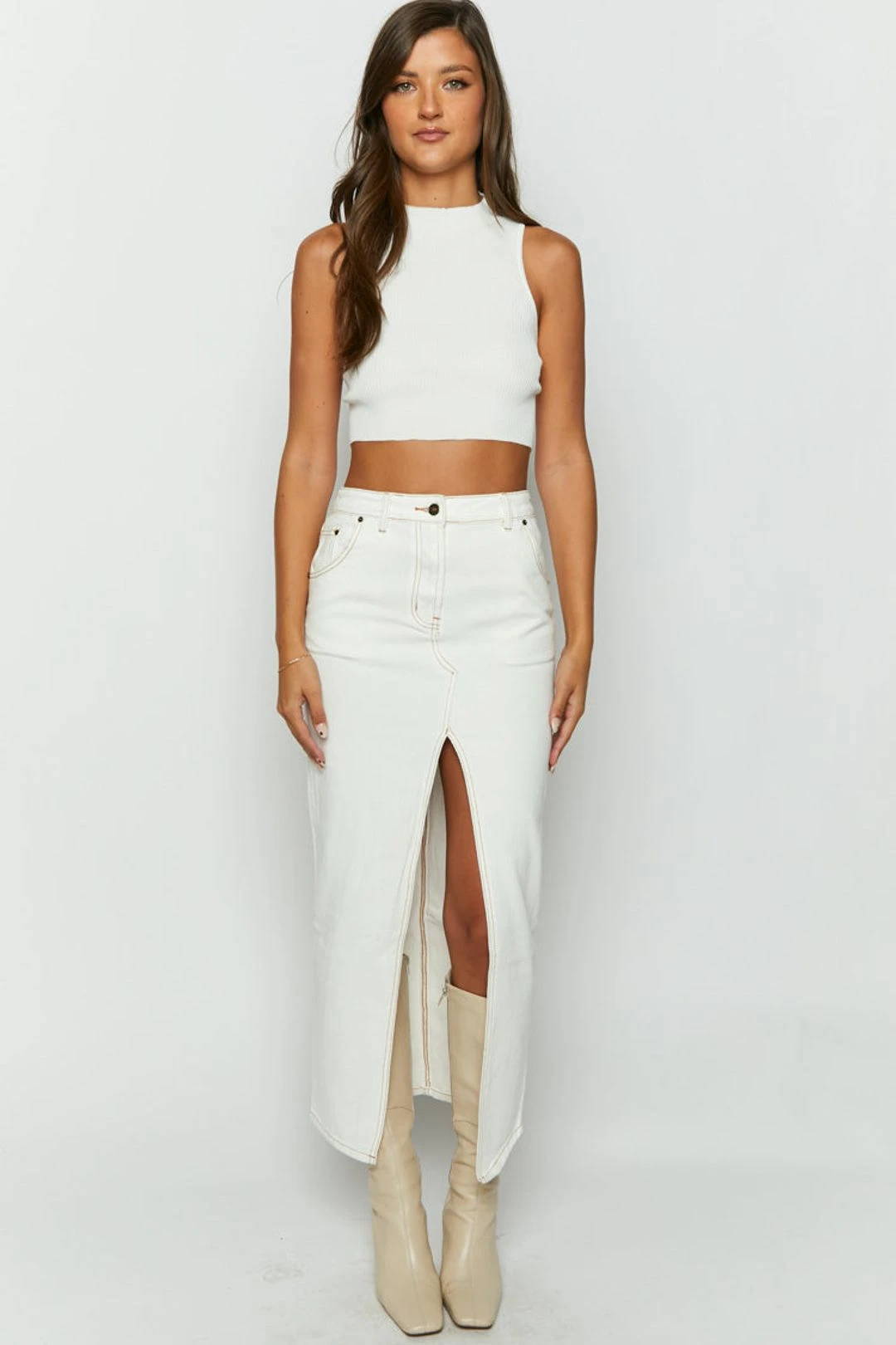 - Loving this contrast split midi skirt for the perfect look whether its your next winter go to with knee high boots and a sweater or for the warmer season styled with a crop top and sandals.