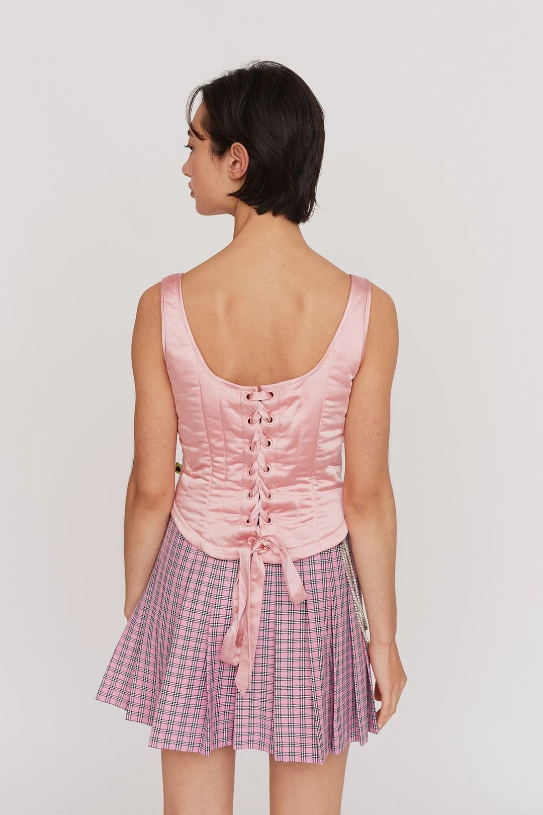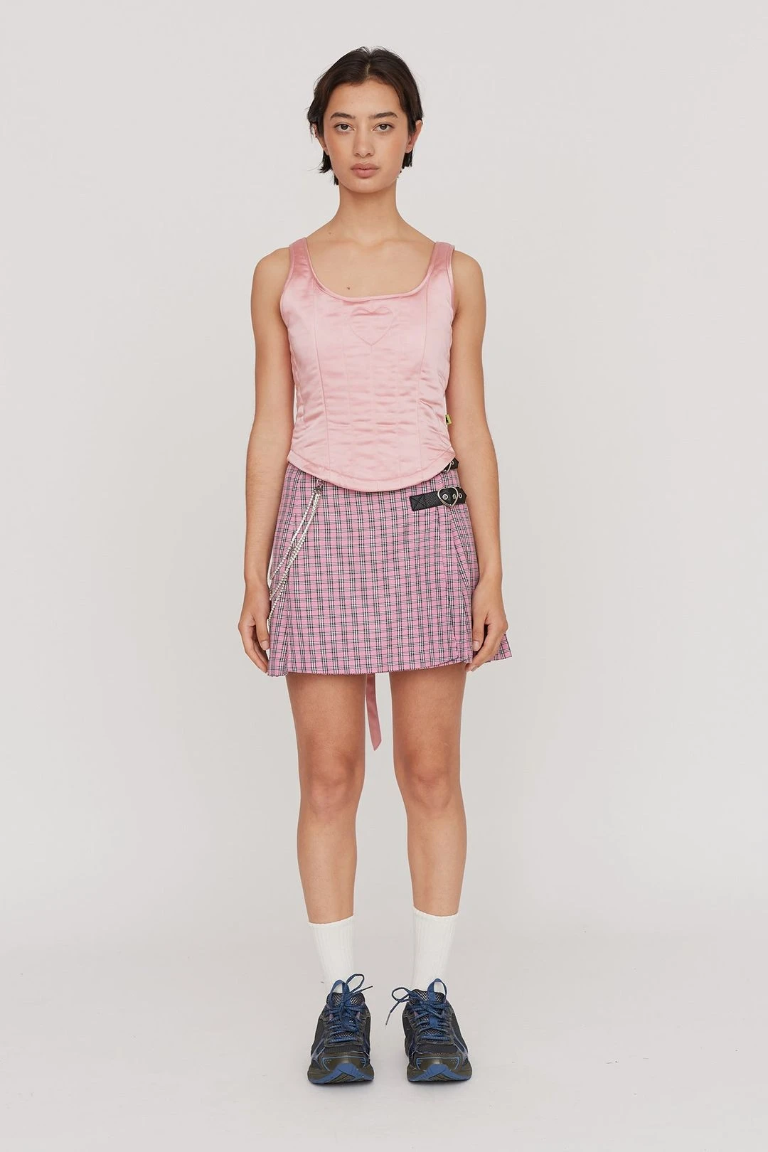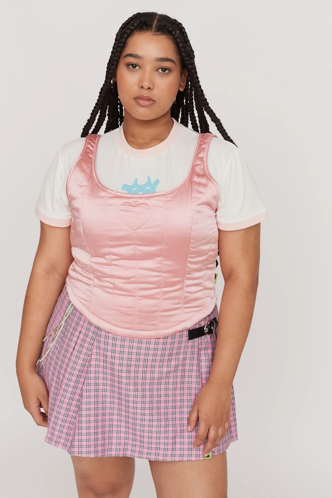 This quilted pink corset top is a part of our collaboration with London based artist, DaddyBears. Inspired by the artist’s use of quilted satin, this is made from a custom quilted fabric and features a heat pressed heart on the chest and a fabric tie on the back. It’s a fitted design meaning it’s true to size, and it can be worn either on its own or over other layers, such as the mesh top from this collection. This piece is 100% vegan, and comes in recyclable packaging.