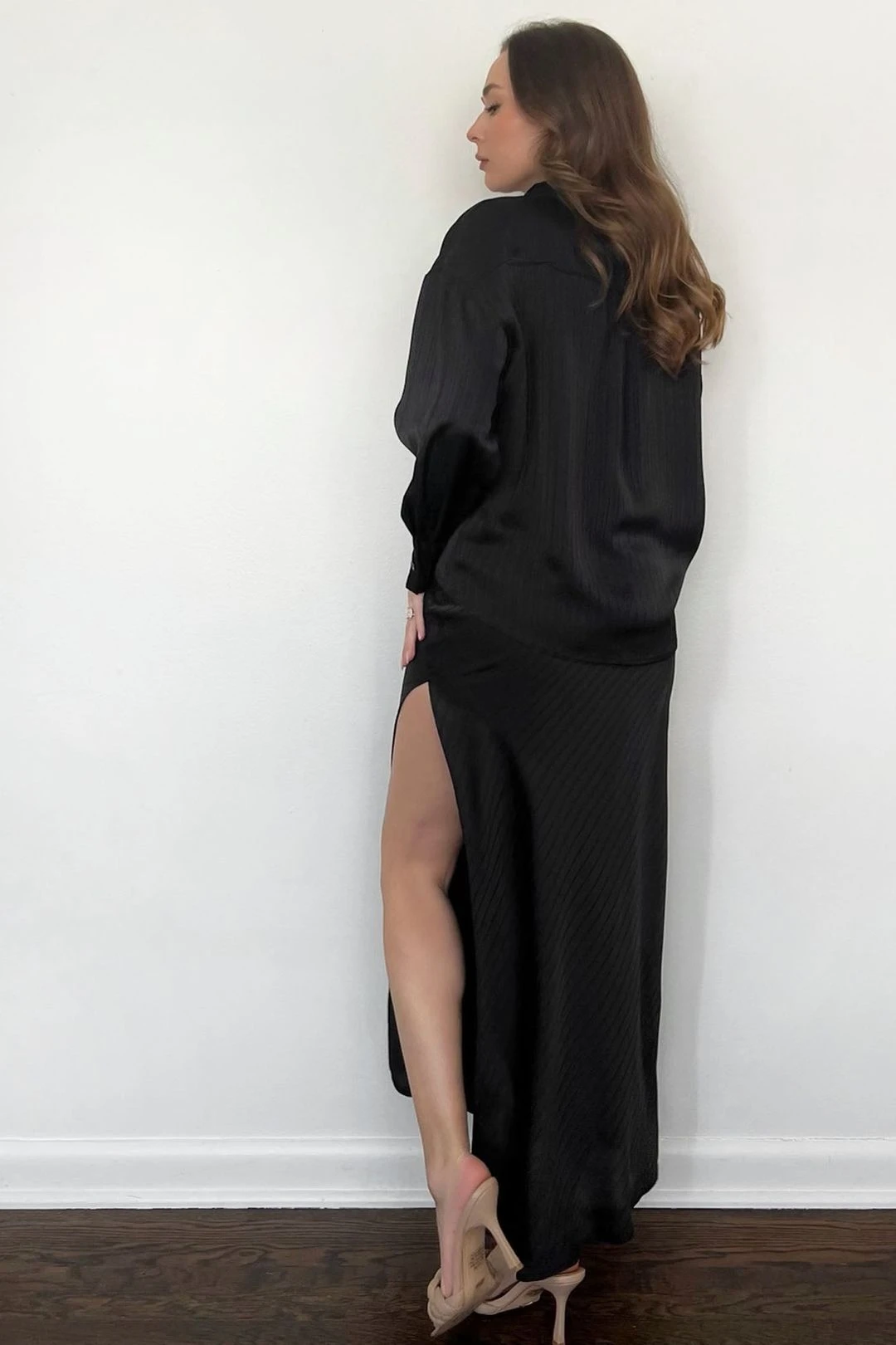 Satin high waisted maxi skirt with mid thigh side slit and side zipper/clasp closure.