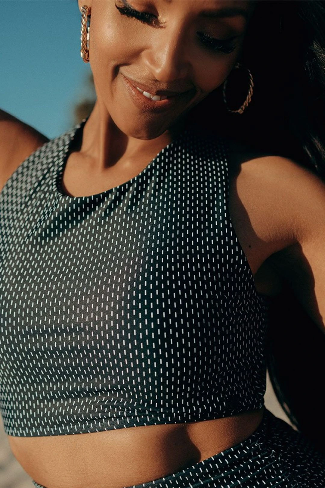 Say hello to our best selling top. EVER. This versatile top is a two-in-one sports bra AND swim top. We love the high neck for full coverage, wide straps for support, and black dash pattern for timeless style.