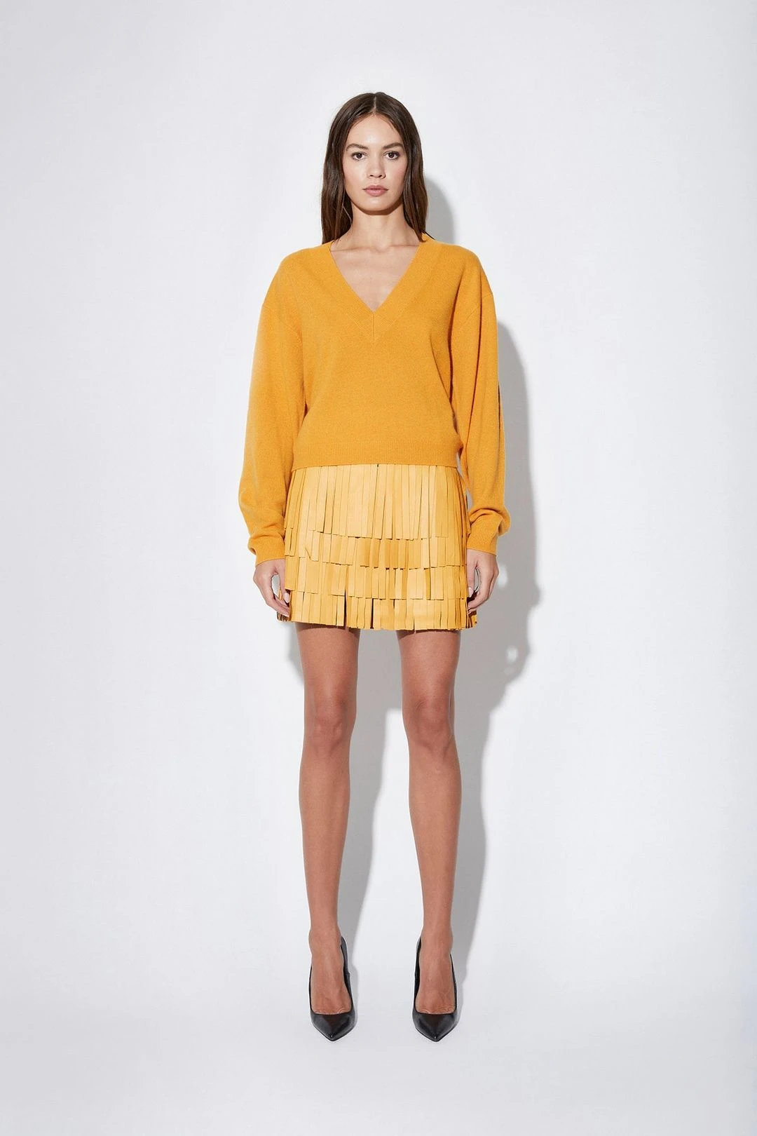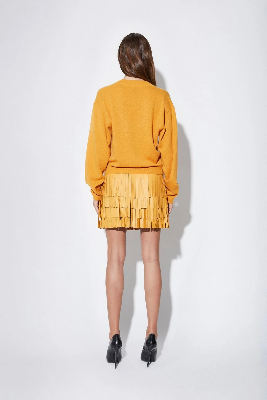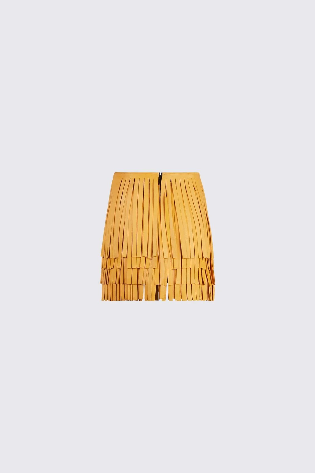 The Marcela Skirt in Honey is a standout mini leather fringe skirt with a mesh lining.
