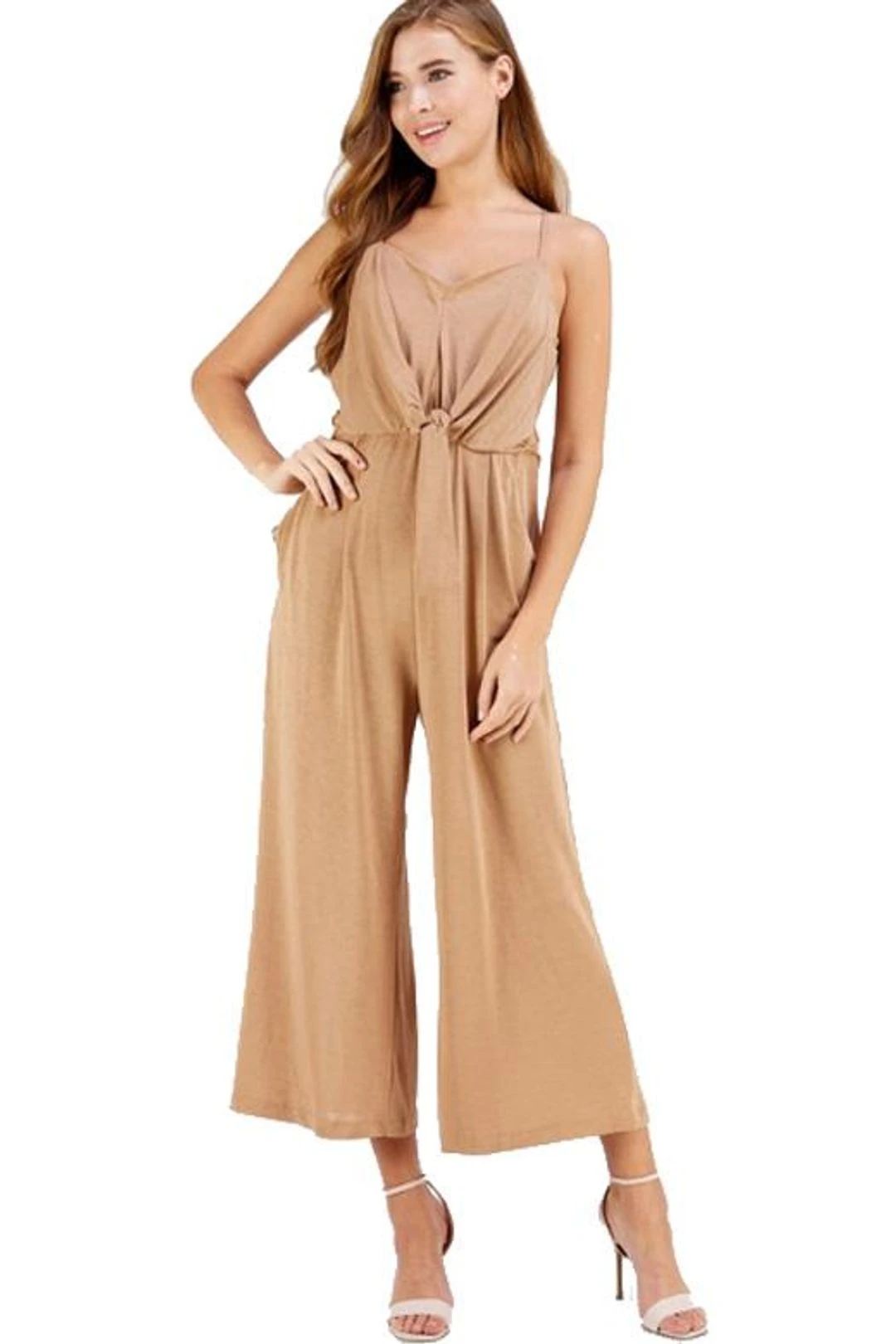 This V-neck jumpsuit with knot detail at front is so AWESOME. With the relaxed waist, relaxed crotch and added stretch, the Marisa is sure to flatter many different body types. It features adjustable straps for just the right fit, side pockets at waist and is non-sheer and lightweight.