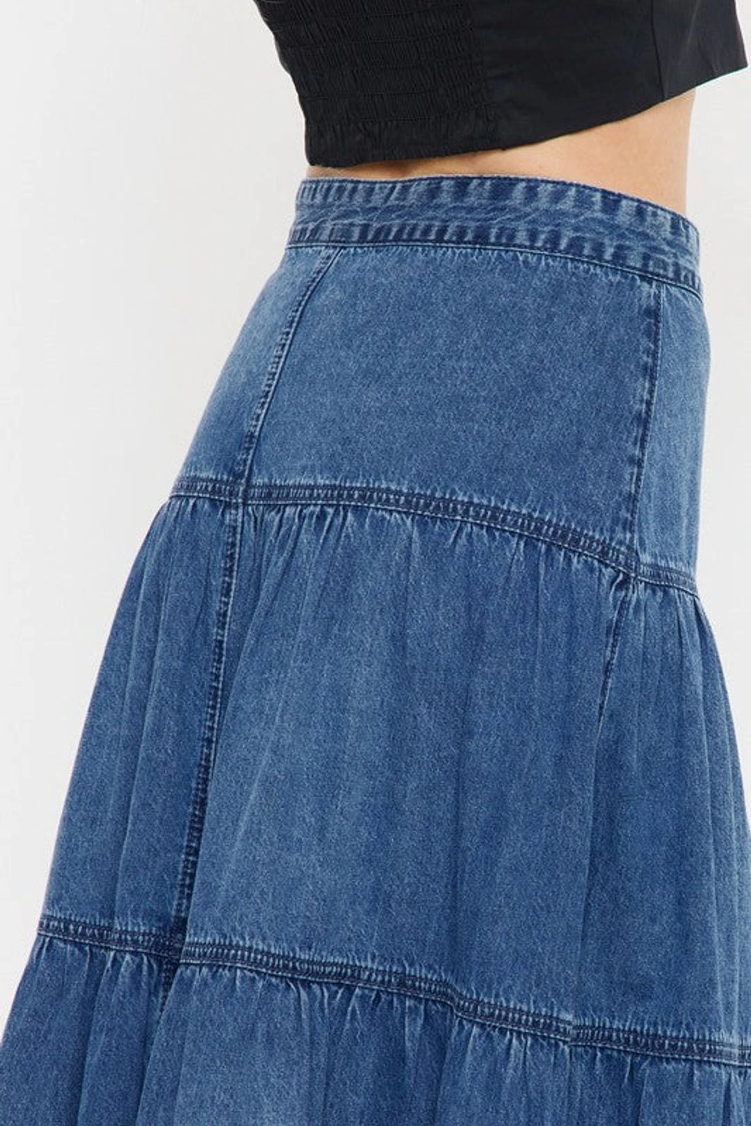 MAXI DENIM SKIRT DARK WASH RIGID REGULAR HEM ZIPPER FLY.